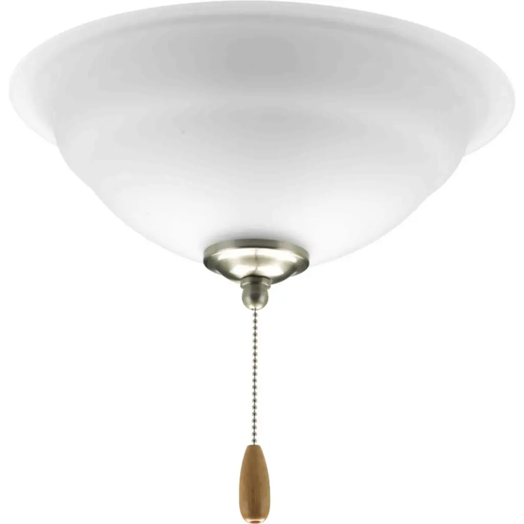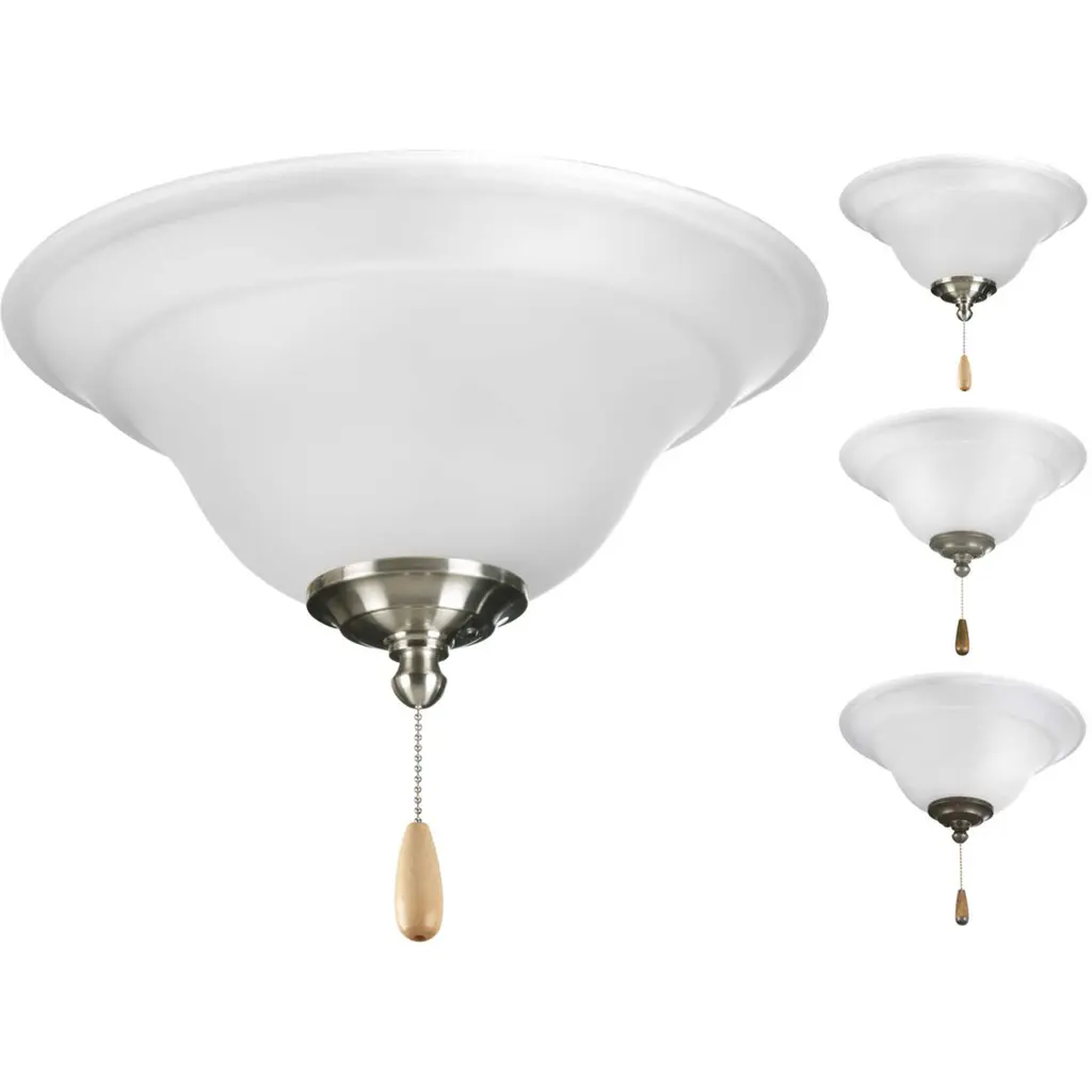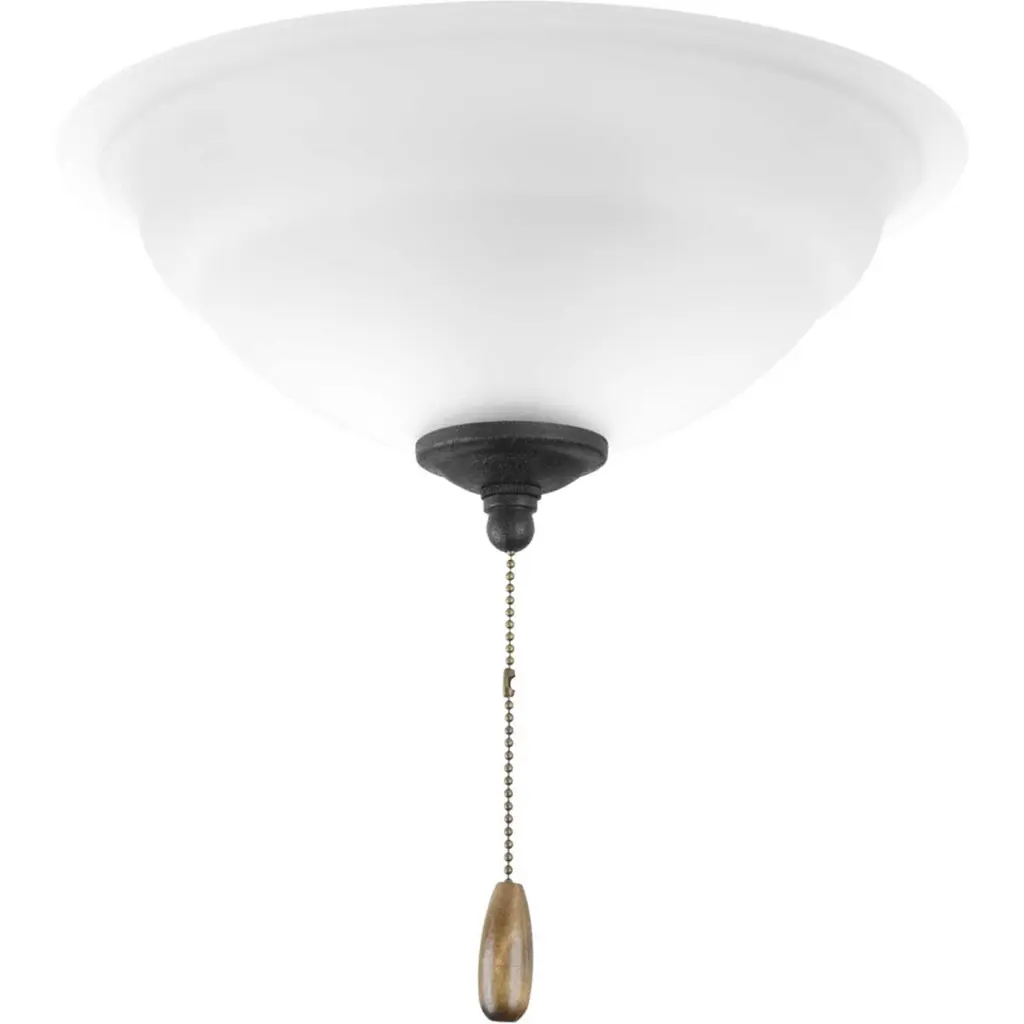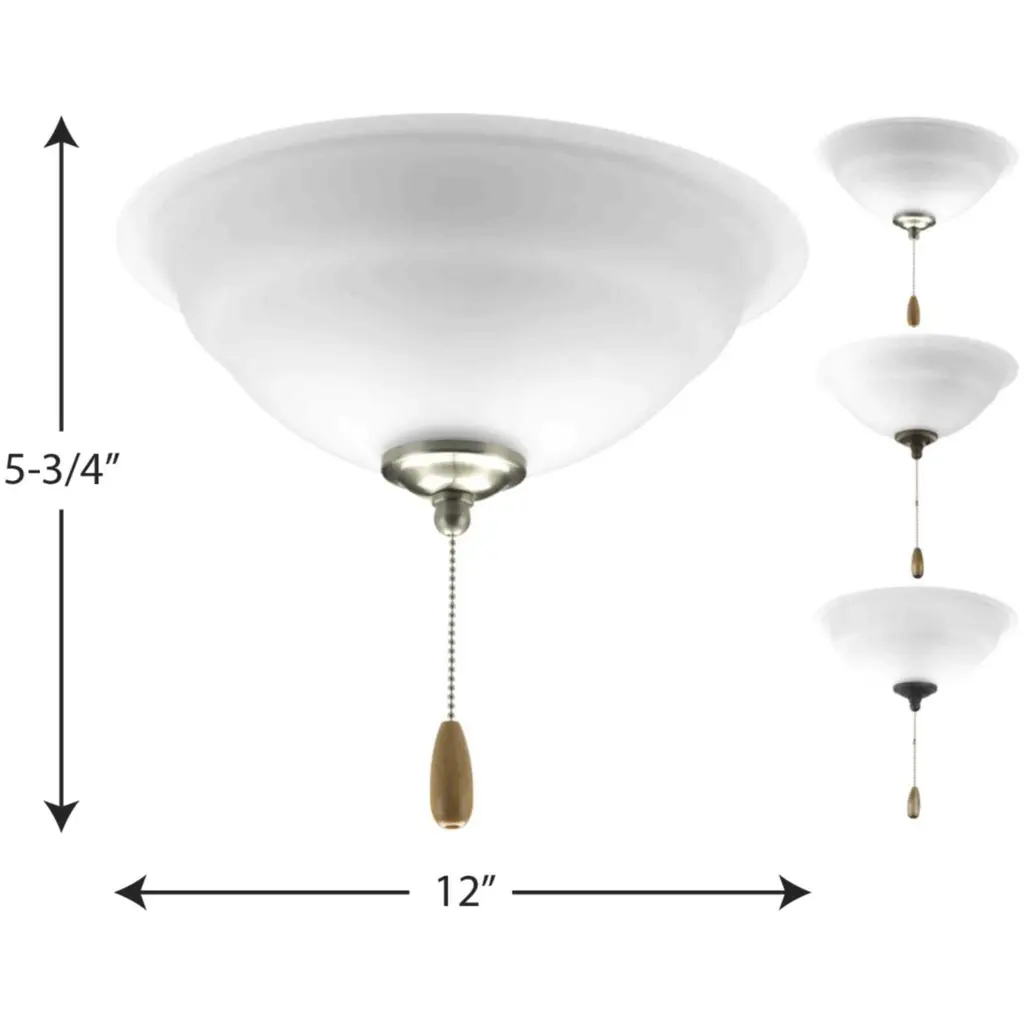 Two-light fan light kit that features a decorative white etched glass bowl. Coordinates with the Torino collection and may other Progress Collections. Finials included are -09 Brushed Nickel, -20 Antique Bronze and -80 Forged Black to match many Progress Lighting fans.Universal style for use with fans that accept an accessory light comes with quick-connect wiring. Includes two 3000K, 800 lumen each (source), Title 24 certified LED bulbs.