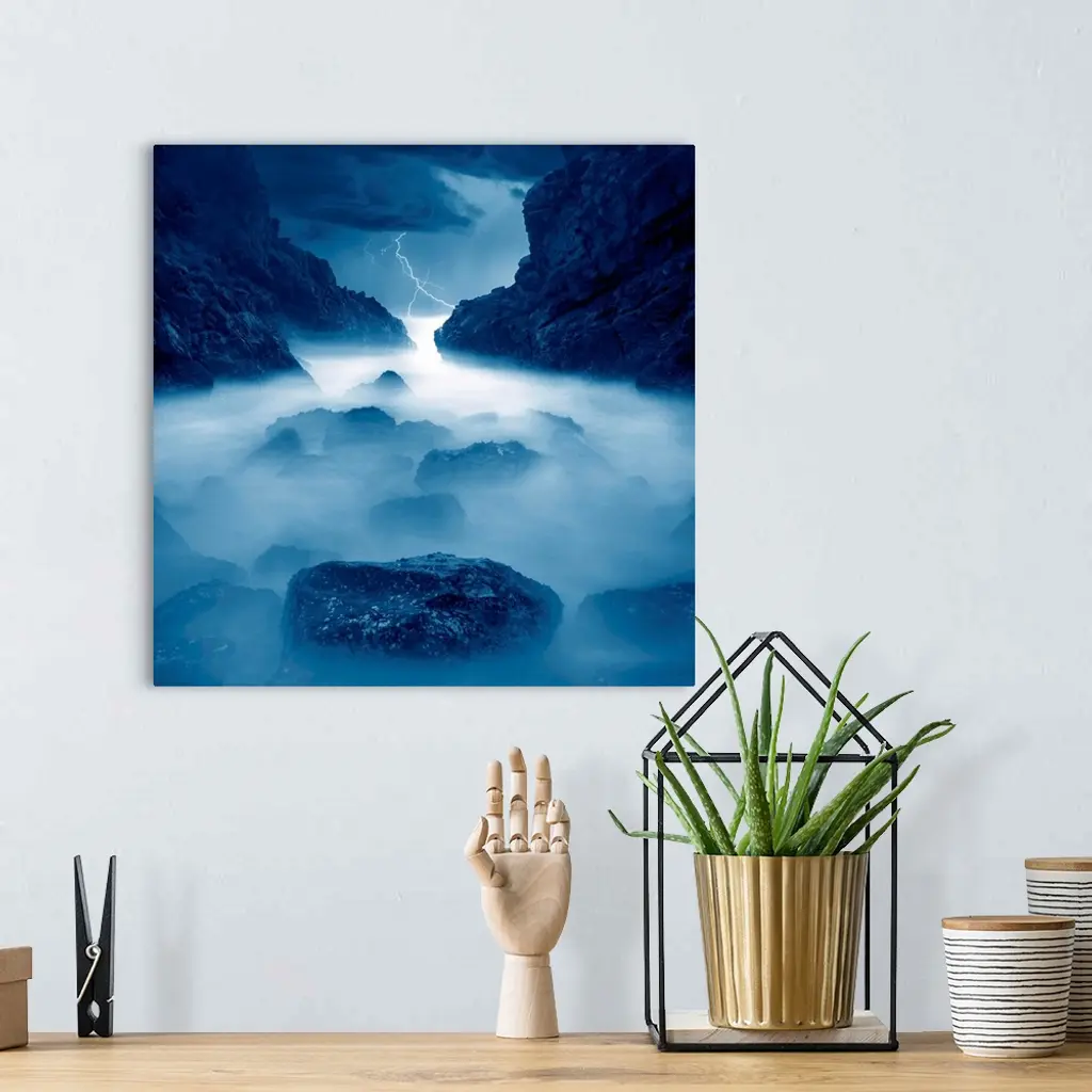 Lightning, rocks, mist, ocean, blue storm