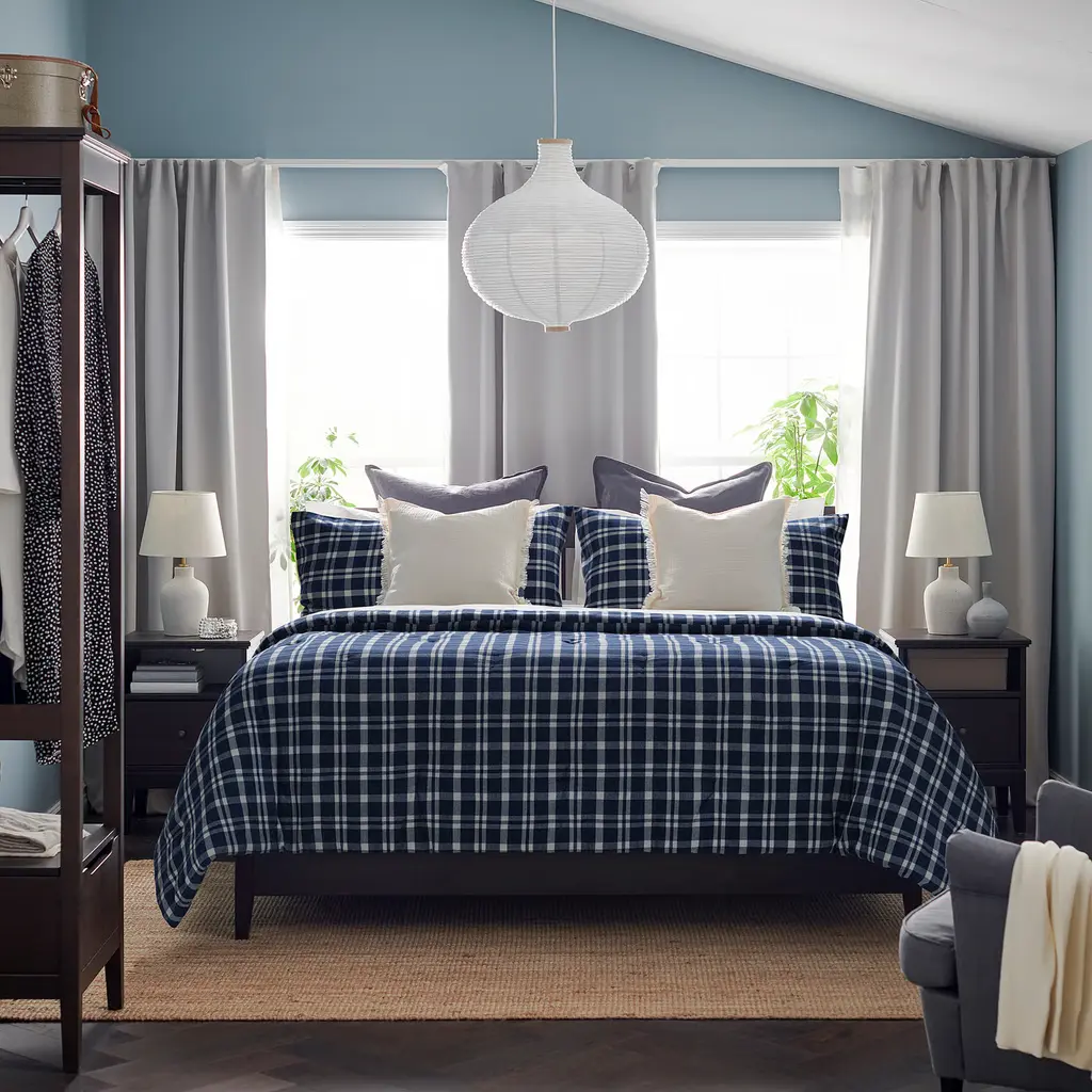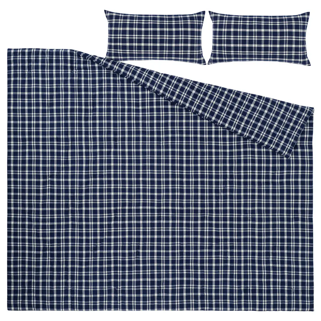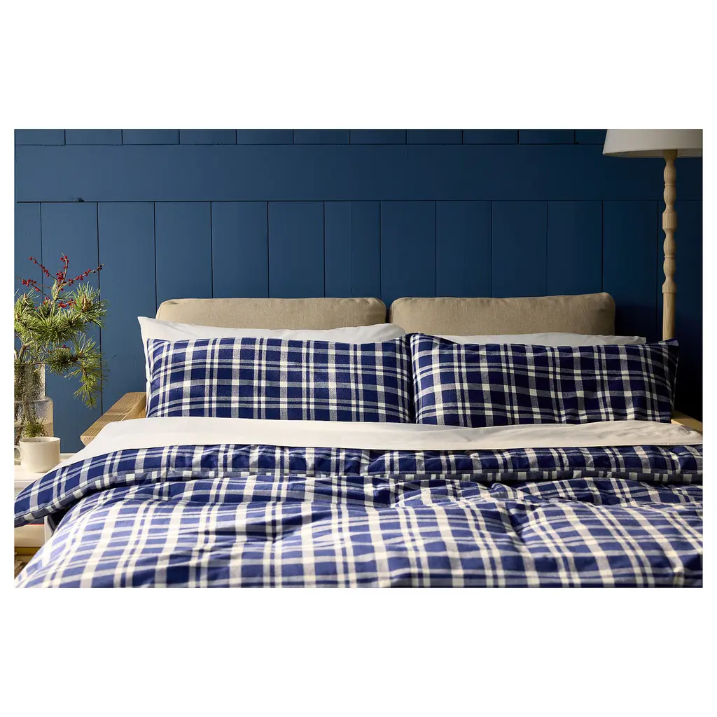 TORNTUSS Comforter set - dark blue/check King. Flannel weave is made from loosely spun yarn that creates insulating pockets of air in the fibers. The lightly brushed fabric feels extra warm and soft against your skin. Like a warm hug on cold nights. 106 thread count. 8-oz filling density.