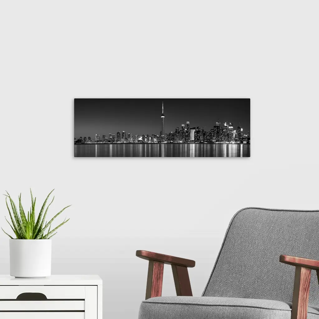 Toronto City Skyline With Cn Tower, At Night, Black And White