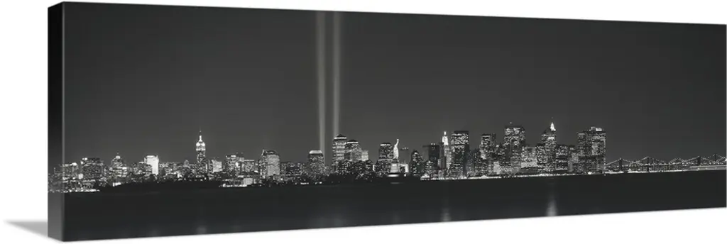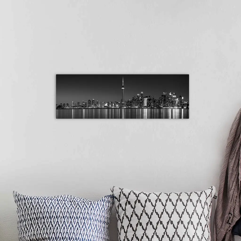 Panoramic photo of the Toronto city skyline with lights reflected in the water at night.