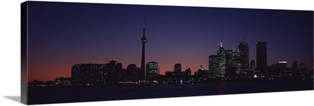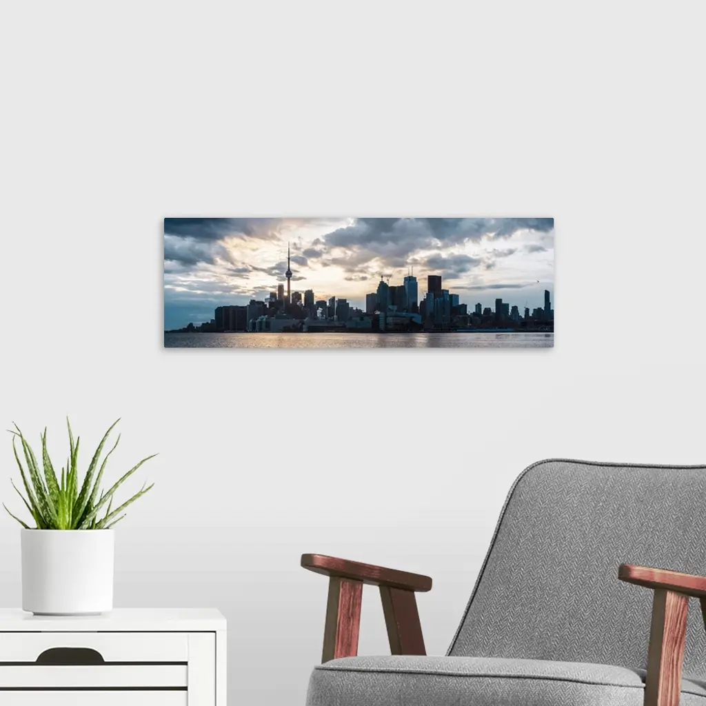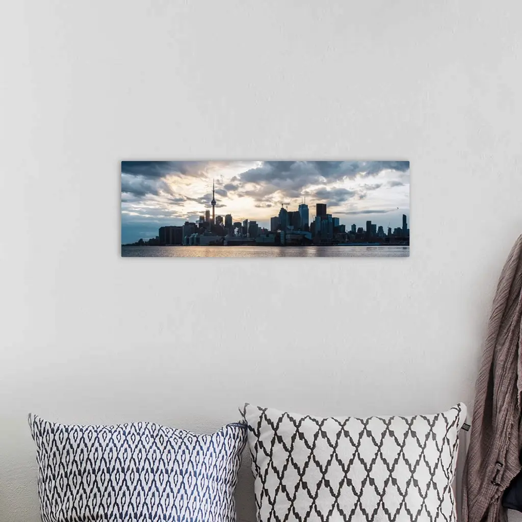 Toronto city skyline under a dramatic sunset with clouds overhead, Ontario, Canada.