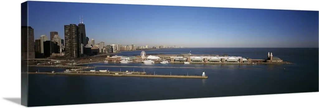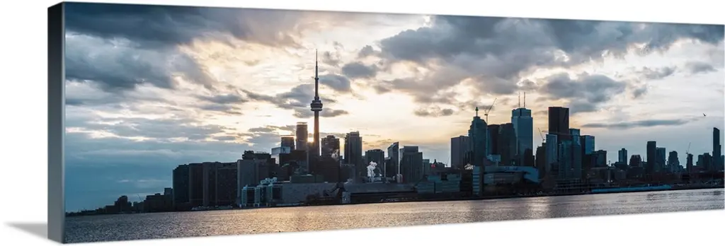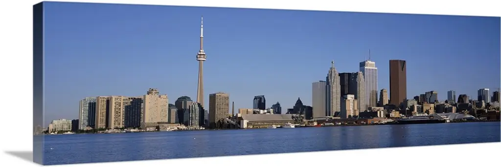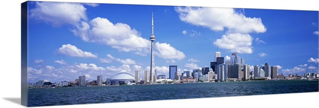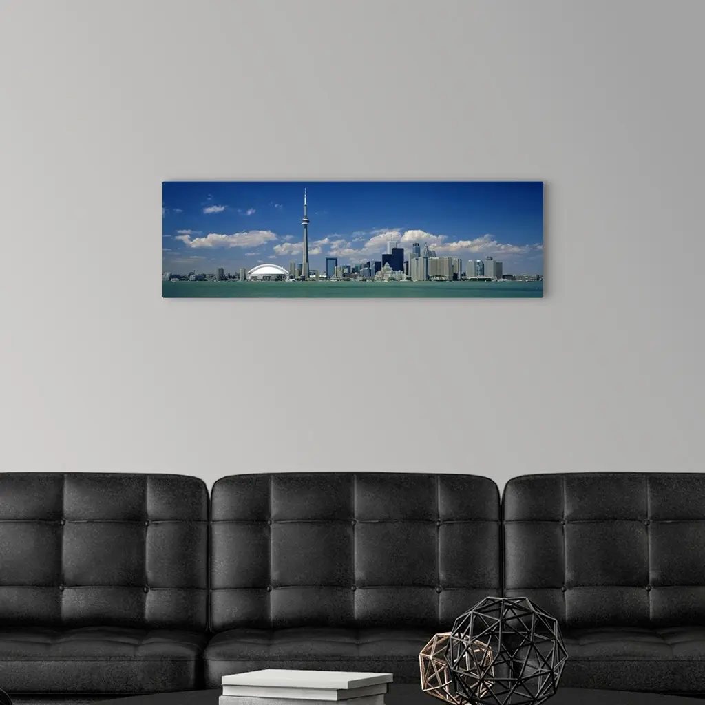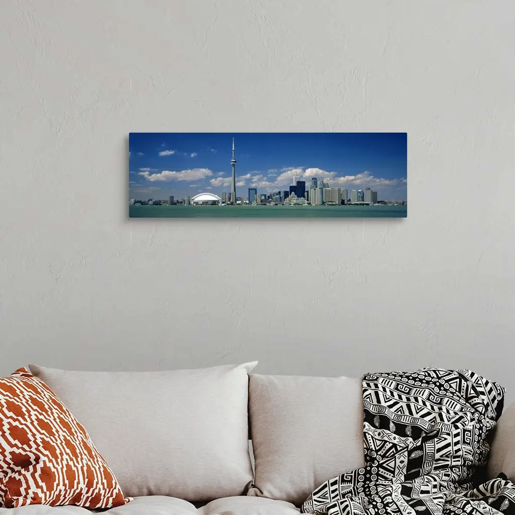 Wide angle photograph on a large canvas of the Ontario skyline, including the CN Tower, in front of a bright blue sky.