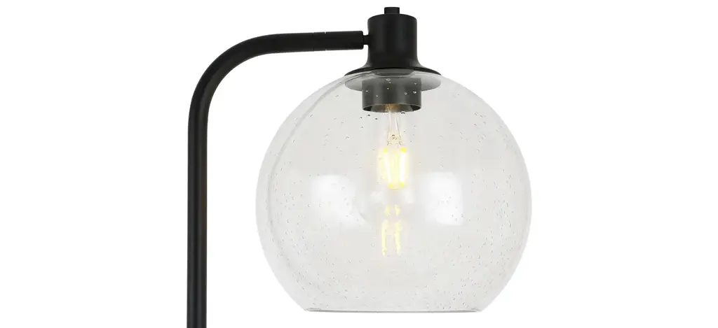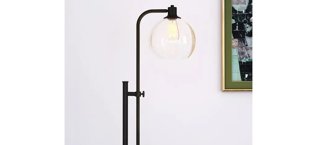 This industrial floor lamp takes notes from factory lighting. It lightens the mood with a seeded glass shade, bringing in natural textures to both the lamp and the room around it. The frame is made of steel and finished in a blackened bronze. The rounded globe shape is open at the end for easy bulb change.