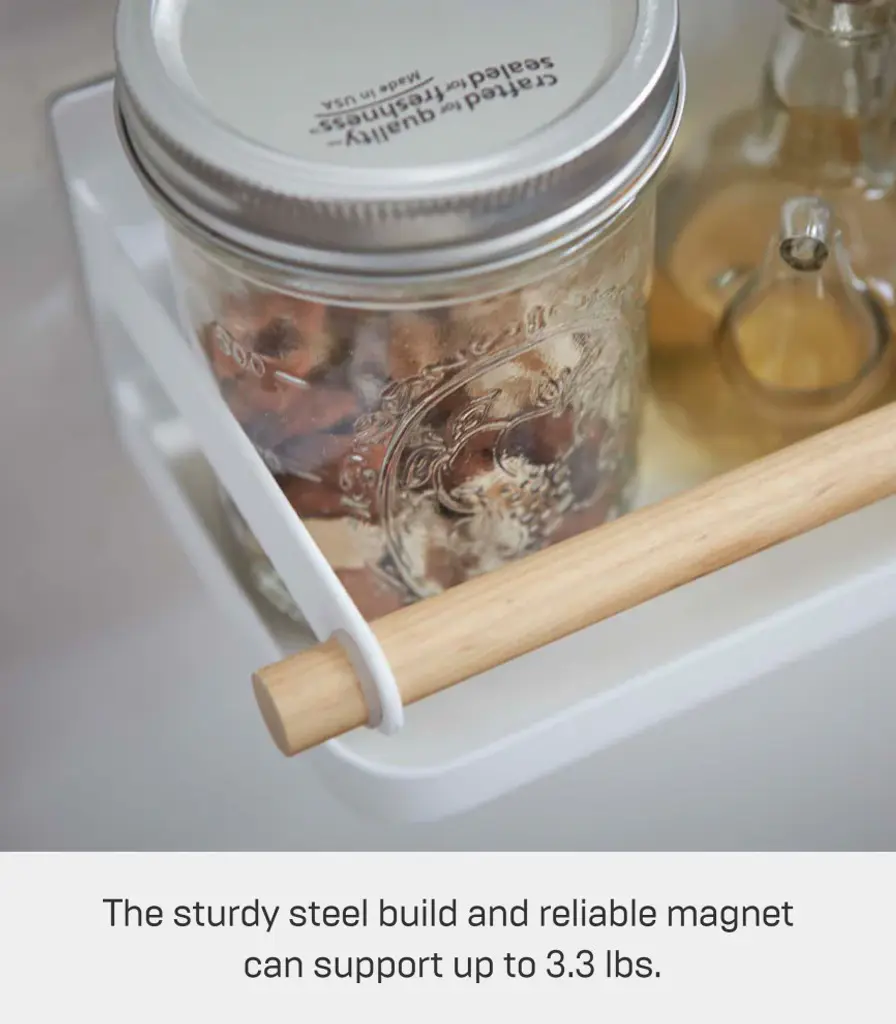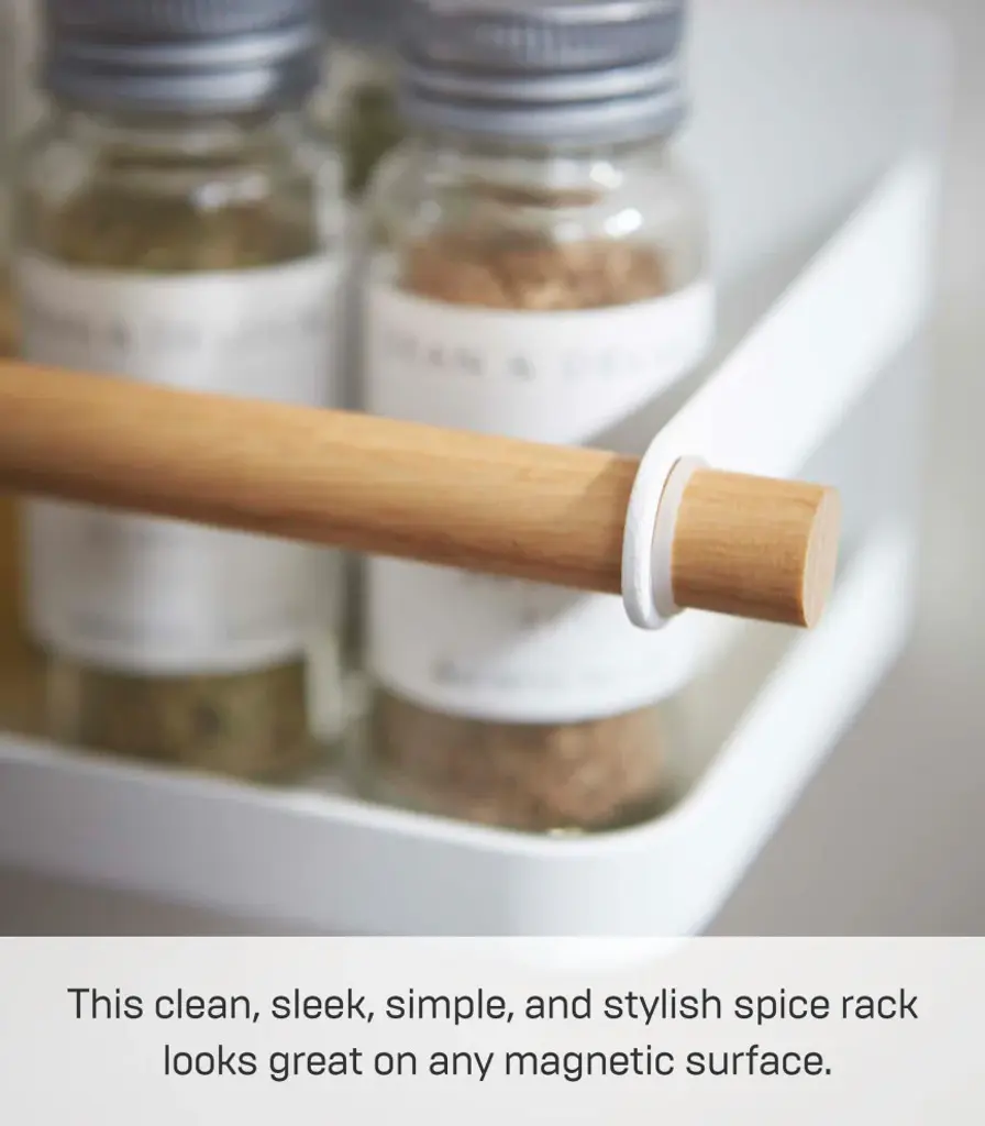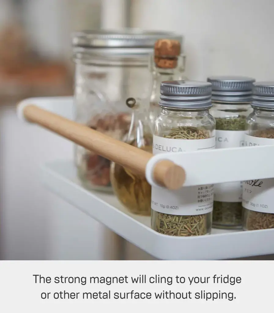 Store cooking spices on the refrigerator with this spice rack and save cabinet space on the spices that you reach for every day. [Details]Specifications:• Materials: Steel and Wood• Dimensions: L 5.1 x W 10.8 x H 3.3 inches• Product weight: 1.7 lb• Load-bearing weight: 3.3 lb• Load-bearing weight: 1.5kg• Designed in Japan
