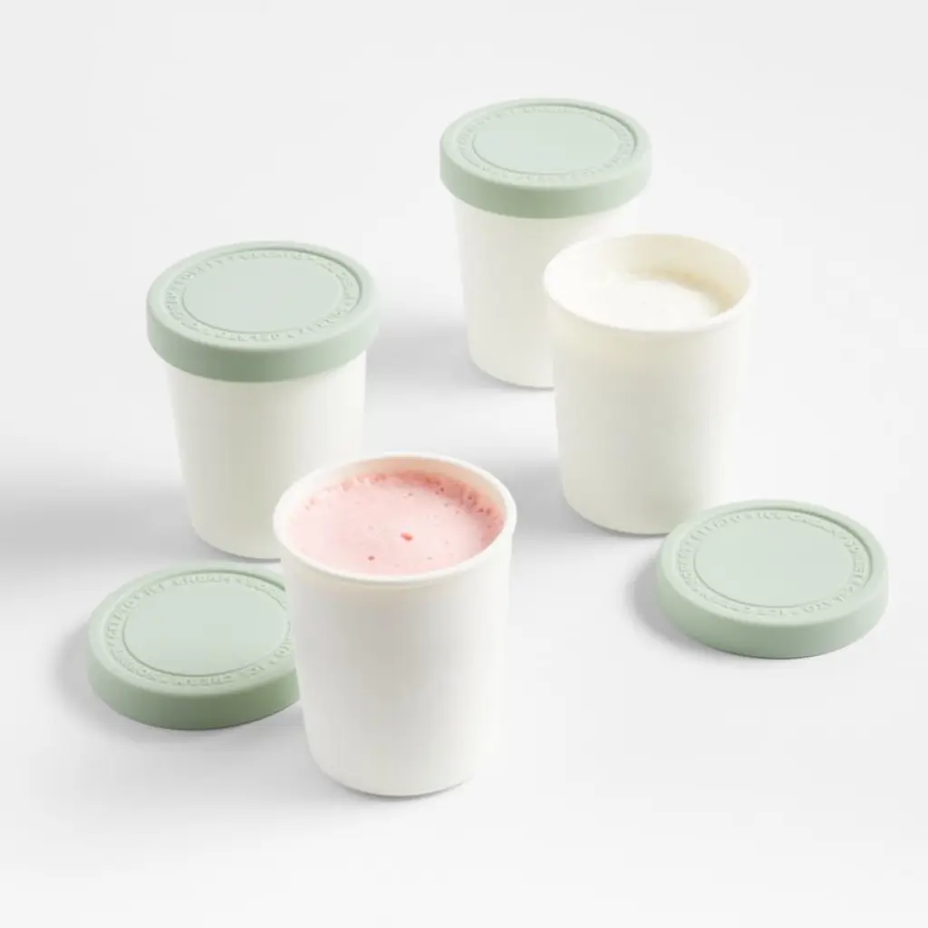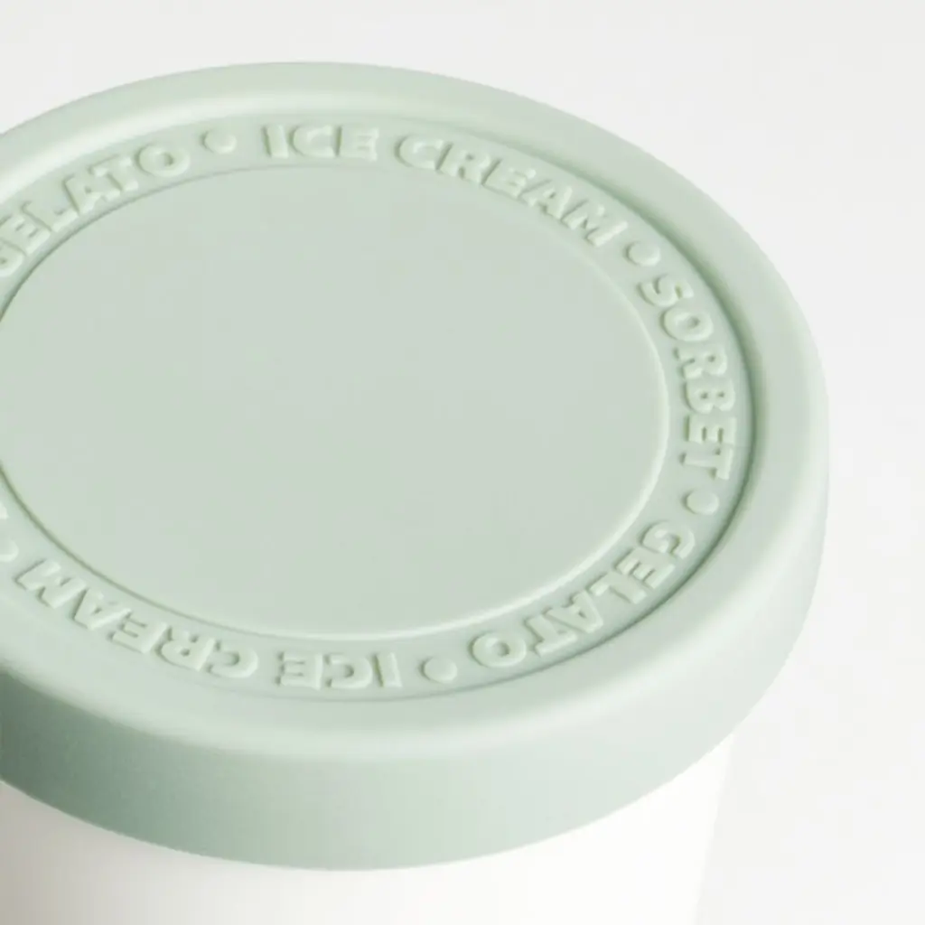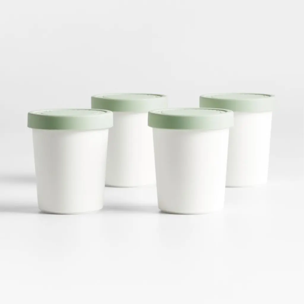 Store your homemade ice cream, gelato, sorbet and frozen yogurt in these sweet little tubs. Topped with minty green silicone lids that go on and off with ease, the bright white ice cream containers store your frozen treats securely and stack to save freezer space. Once the last spoonful is gone, the petite tubs clean up easily in the dishwasher so they're ready for your next cool creations. Part of our exclusive Tovolo ice cream collection, the set of four mini containers makes a thoughtful add-on to the gift of an ice cream maker (sold separately).