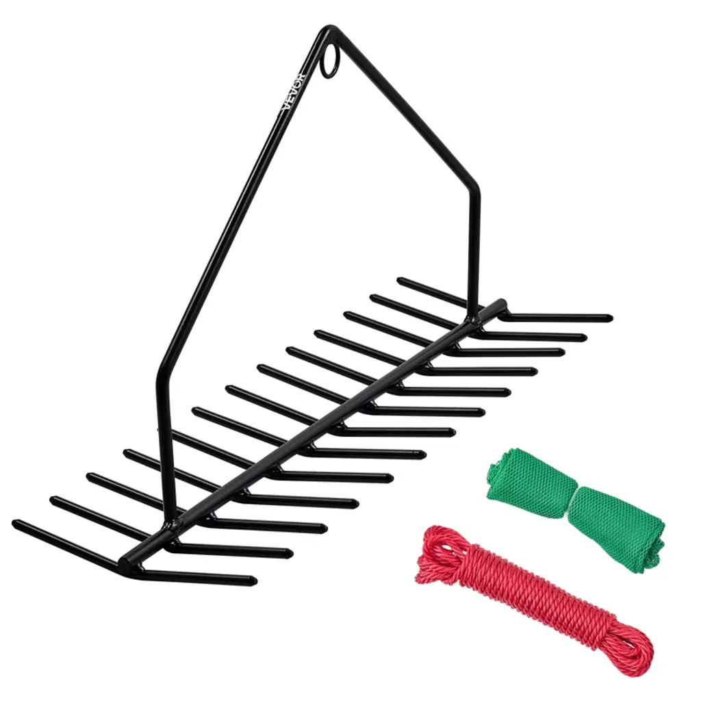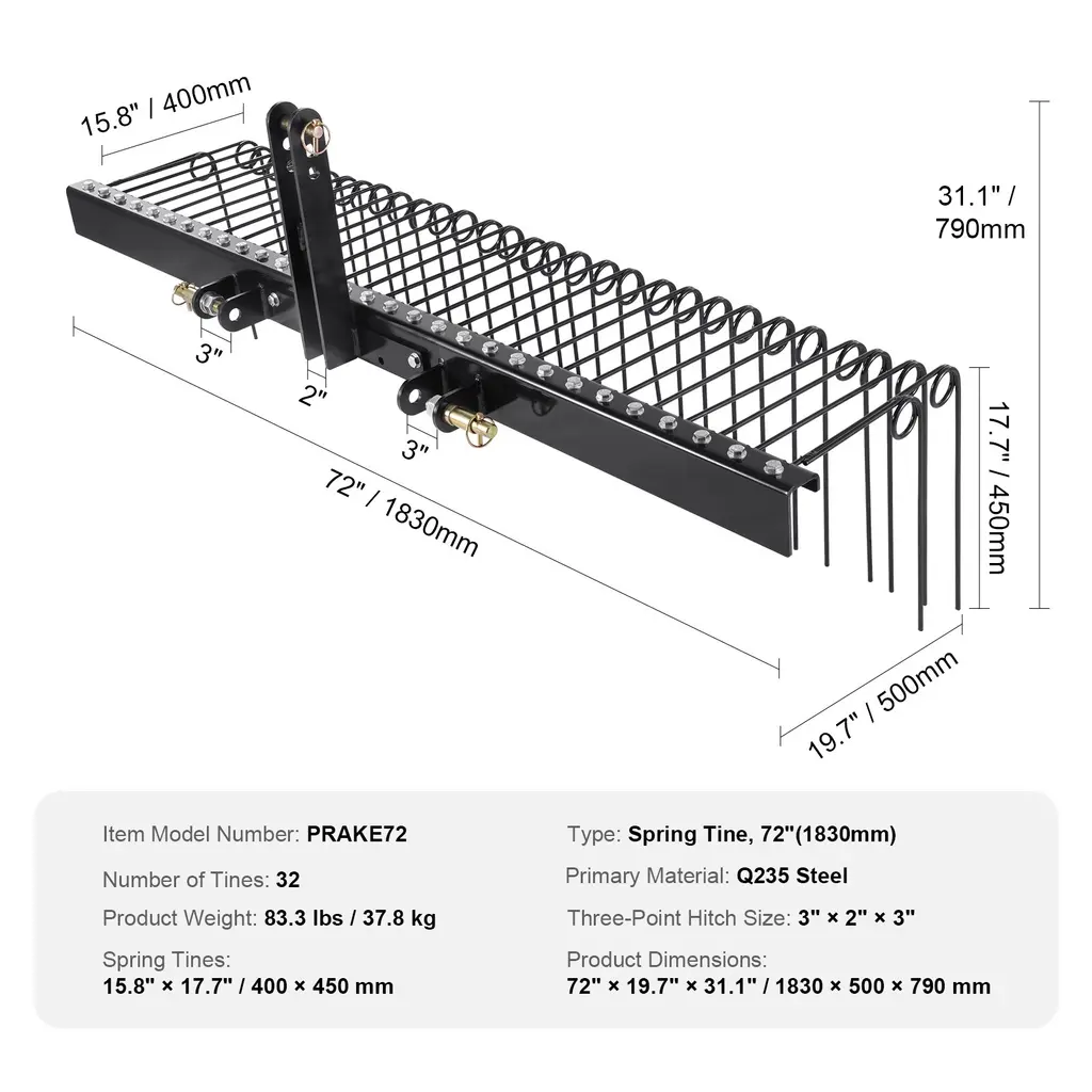 Wide Working Width: With a 72'' / 60'' working width, the tow behind landscape rake covers large areas, increasing efficiency and saving time. It is the ideal tool for efficiently cleaning large yards and lawns. Sturdy Steel Tines: Equipped with 32 ( 72'' option) / 21 (60'' option) durable spring steel tines, this lawn dethatcher rake is built to withstand frequent use without bending or deforming. The tines are robust and wear-resistant, and replacing old or damaged tines is easy with simple tools. Wide Compatibility( 72'' option): The lawn tractor rake easily attaches to Category 1, 3-point hitches, making it compatible with various tractors for ultimate convenience. Universal Compatibility(60'' option) : The lawn tractor rake can be used with 48" or 60" toolbars and three-point suspension systems, easily connecting to various ATV farm machines. Rust-proof Coating: Our tow behind lawn rake features an all-steel design with a rust-proof powder-coated finish for corrosion resistance, ensuring long-lasting use throughout the season without rusting. Versatile Application: This landscape rake is perfect for your yard cleaning tasks, excelling at collecting pine needles, straw, leaves, grass, and other debris, and keeping your yard clean and tidy. Package Content 1 x Tow Behind Dethatcher
