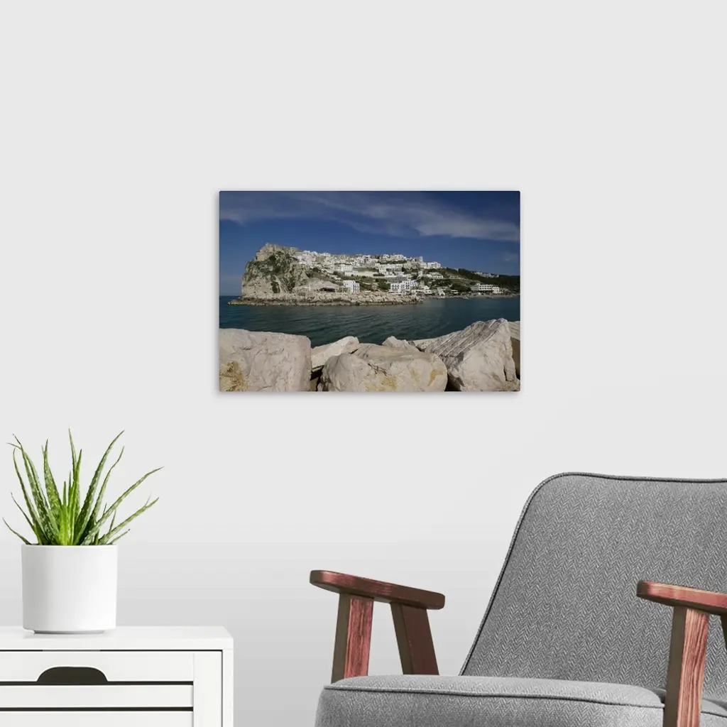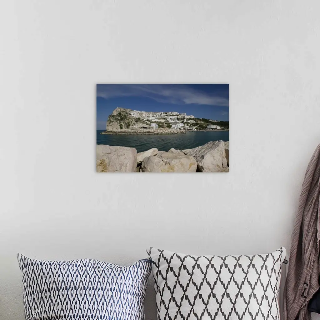 Town on a mountain at the waterfront, Peschici, Promontorio del Gargano, Apulia, Italy wall art for home and office decor. Discover canvas art prints, photos, mural, big canvas art and framed wall art in GreatBigCanvas.com's varied collections.