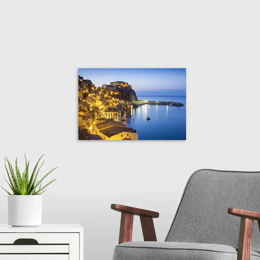 Town View at dusk, with Castello Ruffo, Scilla, Calabria, Italy