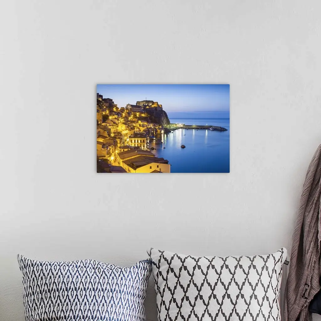 Town View At Dusk, With Castello Ruffo, Scilla, Calabria, Italy