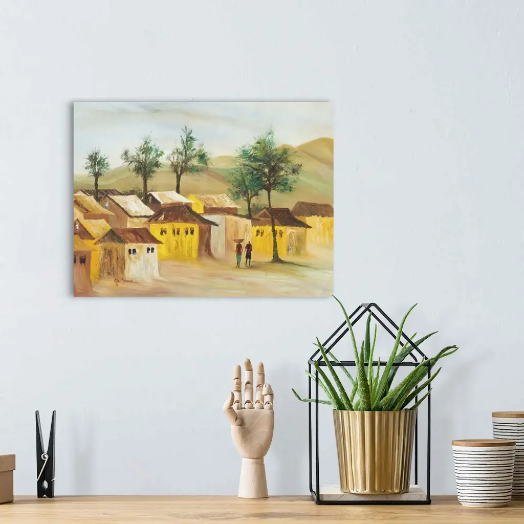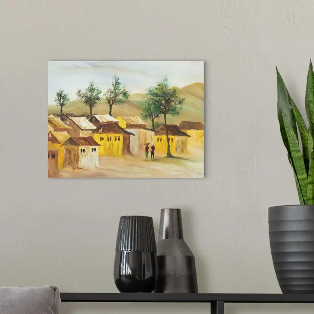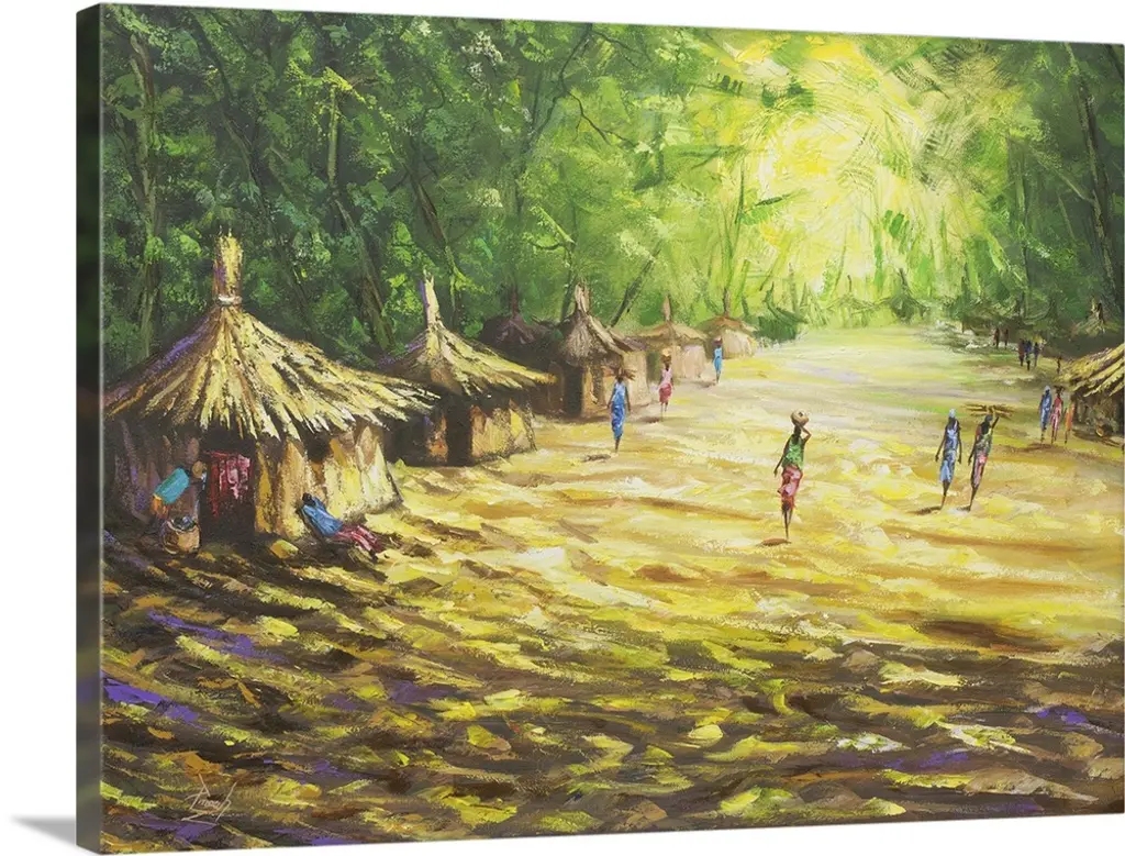 Godwin Atta Geoman reveals his love for African landscapes as he depicts a scene from Kwadaso in western Ghana. Traditional homes built of clay and thatch nestle beneath tall trees for shade, and townspeople go about their daily activities together.