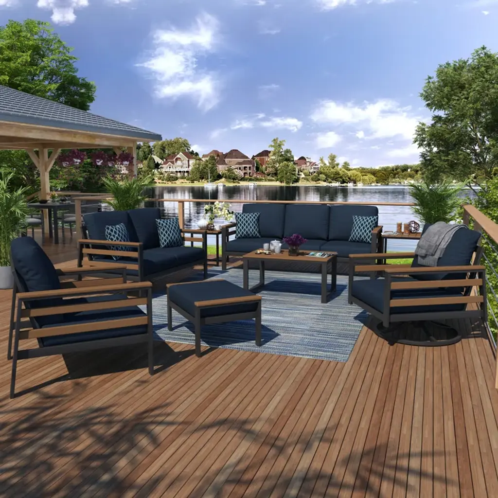 Elevate your backyard hangout spot with this 8-piece outdoor seating group, bringing a modern look and extra seating to your patio or deck. It includes two armchairs (one of which rocks), a sofa, a loveseat, and multiple tables. Each piece is crafted from metal with a sleek dark gray finish, while Sunbrella® performance fabric cushions are filled with foam to provide just the right amount of support as you relax. This set is also UV-resistant, so it easily maintains its color under the sun.