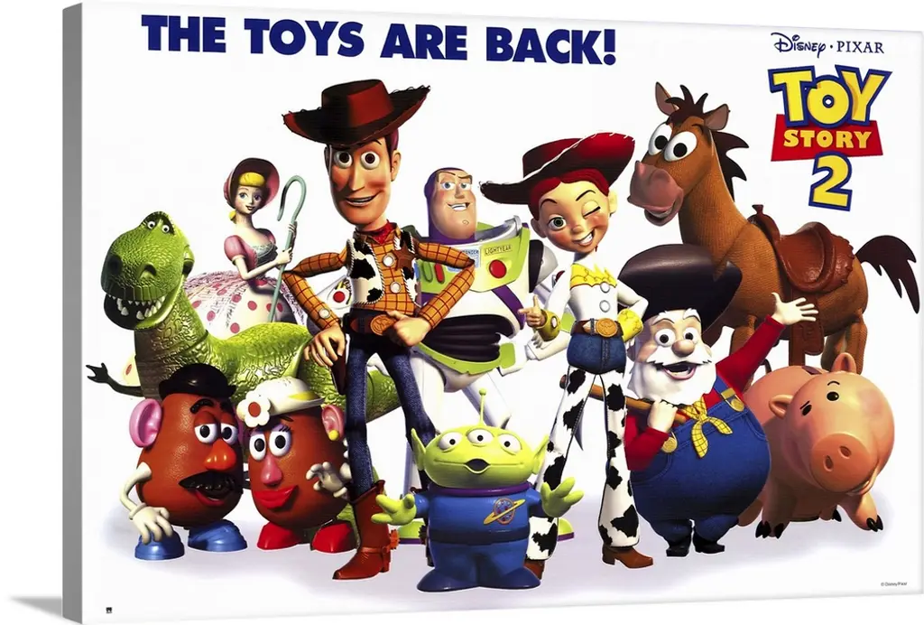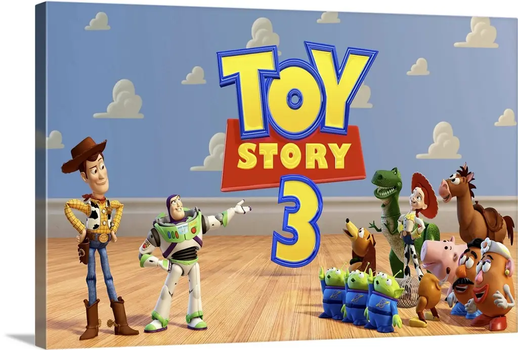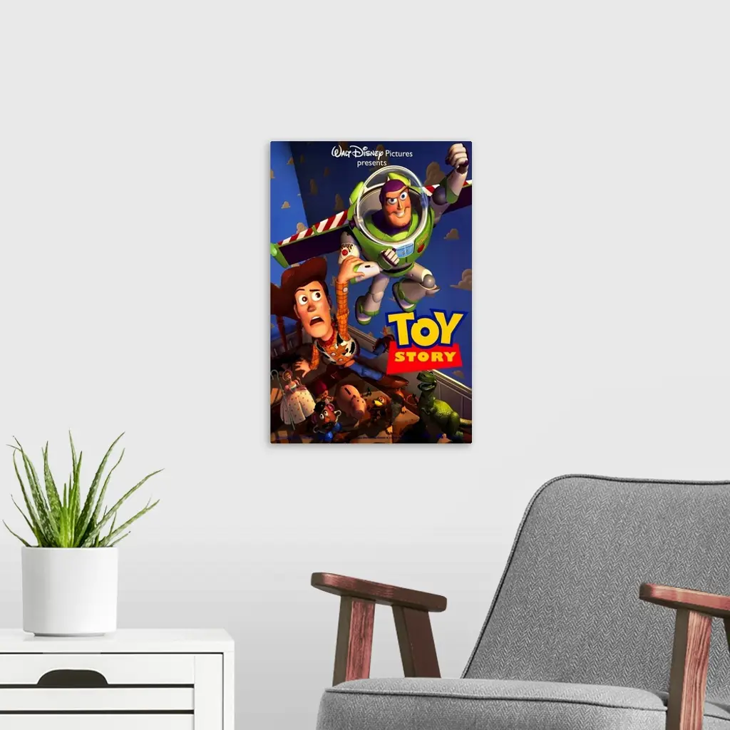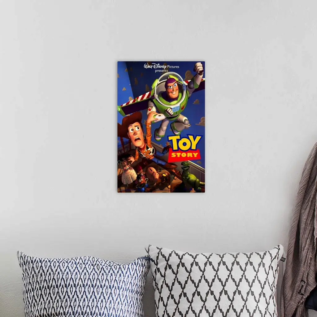Portrait, large movie poster of Toy Story. Buzz lightyear flying through the air, Woody holding onto his arm, while the other toys in Andy's room watch from below. "Walt Disney Pictures presents" at the top, "Toy Story" at the bottom.