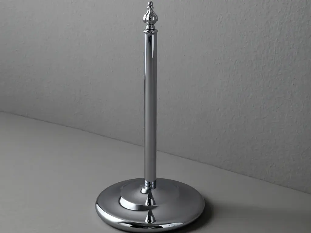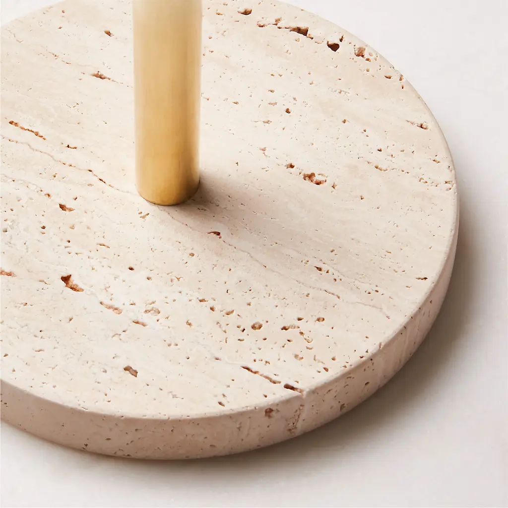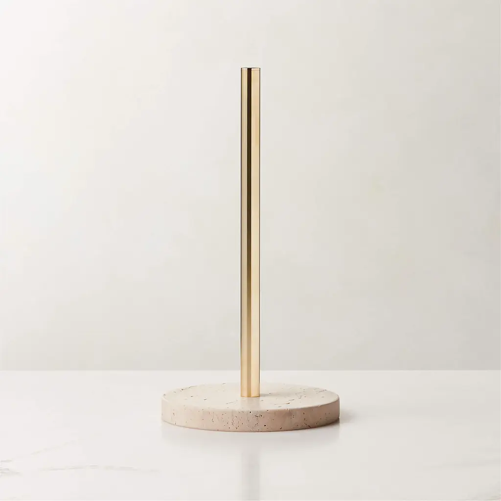 Honed white travertine paper towel holder adds natural warmth to the kitchen. CB2 exclusive. Due to the nature of the material, brass patina will vary in color and darken over time.