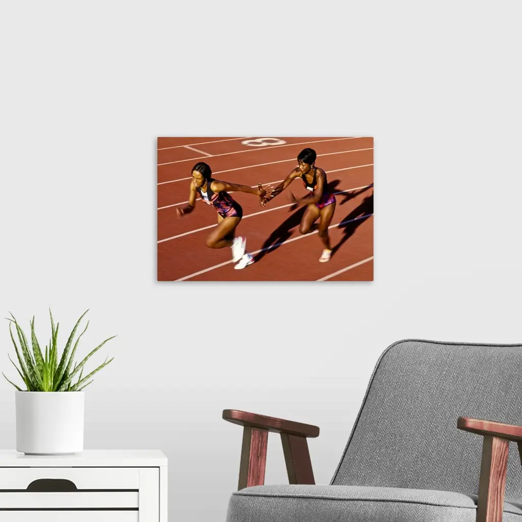 Track and field relay baton pass wall art for home and office decor. Discover canvas art prints, photos, mural, big canvas art and framed wall art in GreatBigCanvas.com's varied collections.