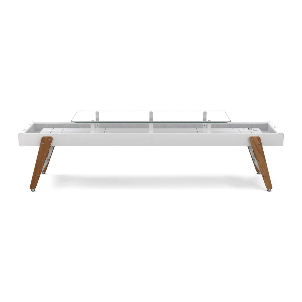 Bringing sophistication and refinement to any gathering, the Track Dining Shuffleboard from RS Barcelona impresses with a durable epoxy-resin playing field, FSC-certified iroko wood legs and a colorful steel silhouette. The addition of an ultra-sleek glass top turns this game table into the hottest spot to gather for a round of drinks and competitive play. Highlights
