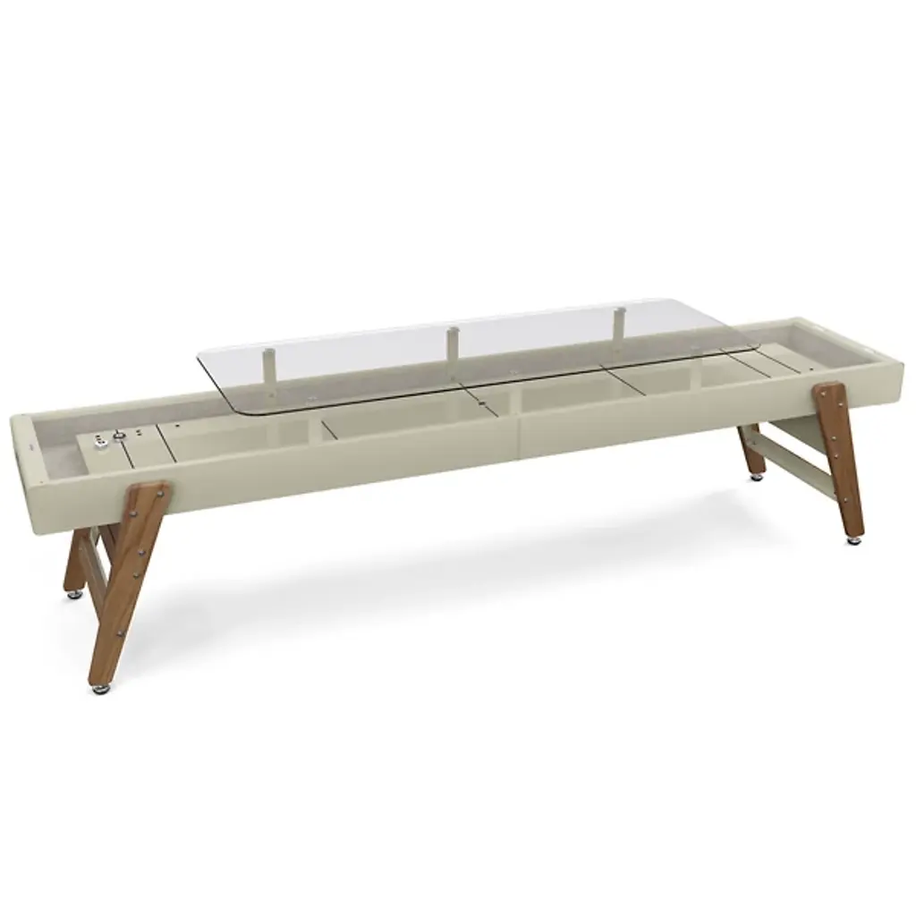 Give ample elegance and a sense of play to indoor spaces with the Track Dining Shuffleboard from RS Barcelona. A strong contemporary design from the mind of Rafael Rodriquez, this furnishment is constructed in Spain and includes the pucks and shuffleboard powder needed to play. The robust construction ascends from four sustainably sourced legs of strong Iroko wood, placing a painted, powder-coated steel housing above that holds the epoxy-resin board, clearly marked for play. A series of slender brackets supports a tempered-glass tabletop above, offering a place to rest food and drink while you play.