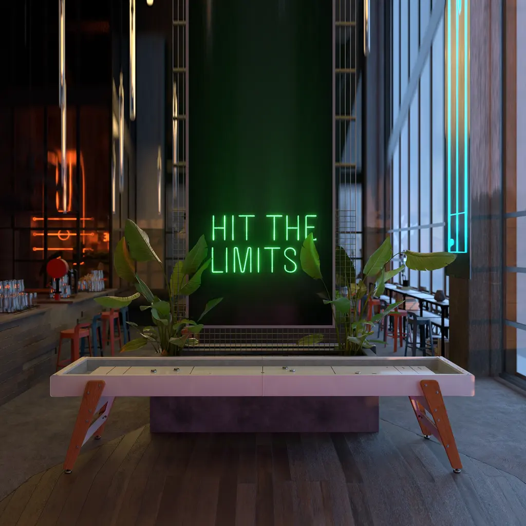 Experience a luxurious take on a classic game with the Track Shuffleboard from RS Barcelona. Featuring exceptional craftsmanship, its steel body is accented by sustainably-sourced iroko wood legs, complemented by a sleek powder coating for unmatched durability. An epoxy-resin playing field ensures exceptional playing conditions, inspiring friendly competition day and night. Highlights