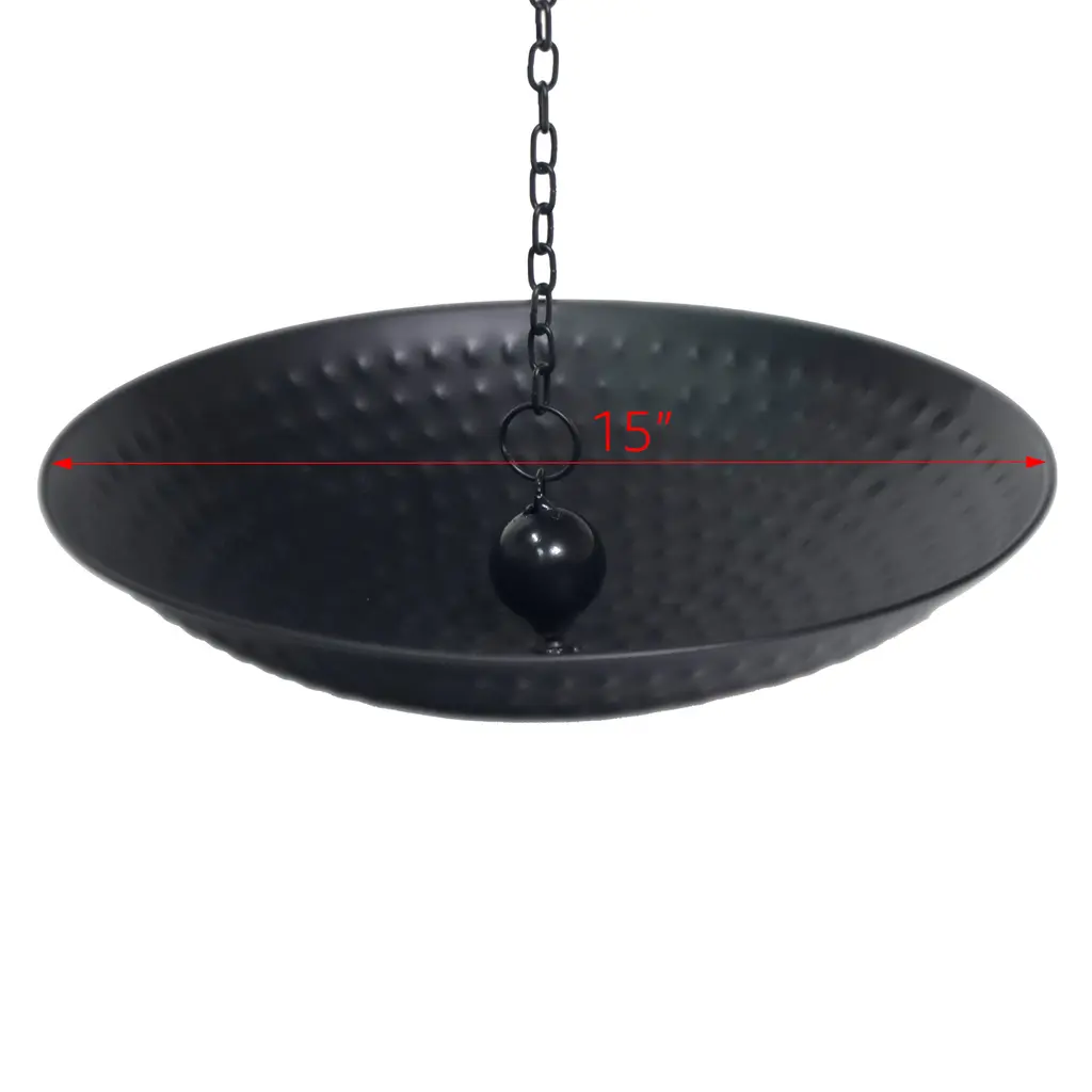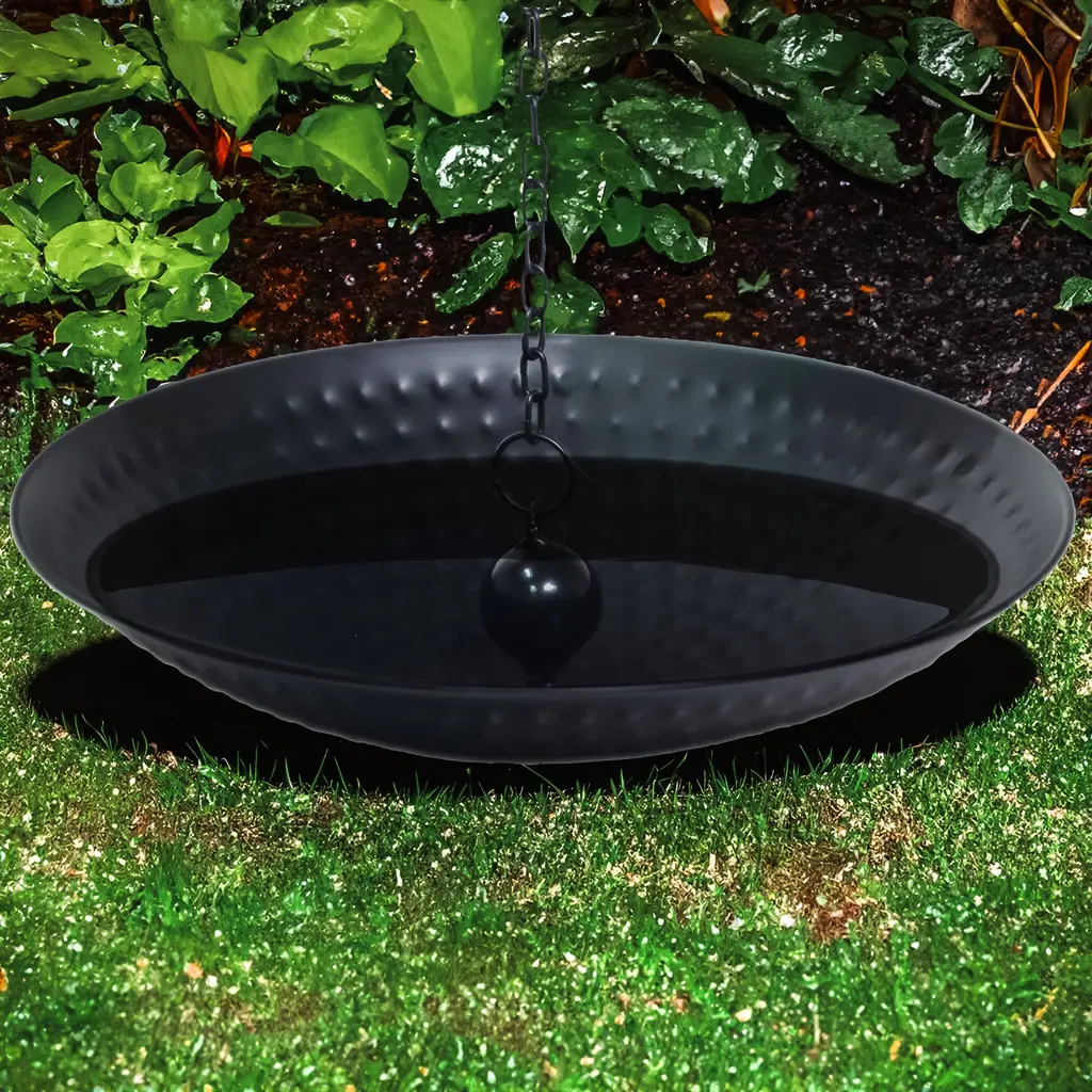 This rain chain basin is the perfect addition to your rain chain and gutters to create a beautiful water feature. The basin measures 12 inches in diameter and includes a 16 inch long chain that can be easily attached to any rain chain. Made from powder coated steel, the basin is durable and includes a bolt in the bottom that can be loosened to drain any accumulated water. We recommend adding stones in the bottom for added weight and stability as well as providing a soothing sound as the water hits the rocks. By Trademark Innovations. Ages 14+.