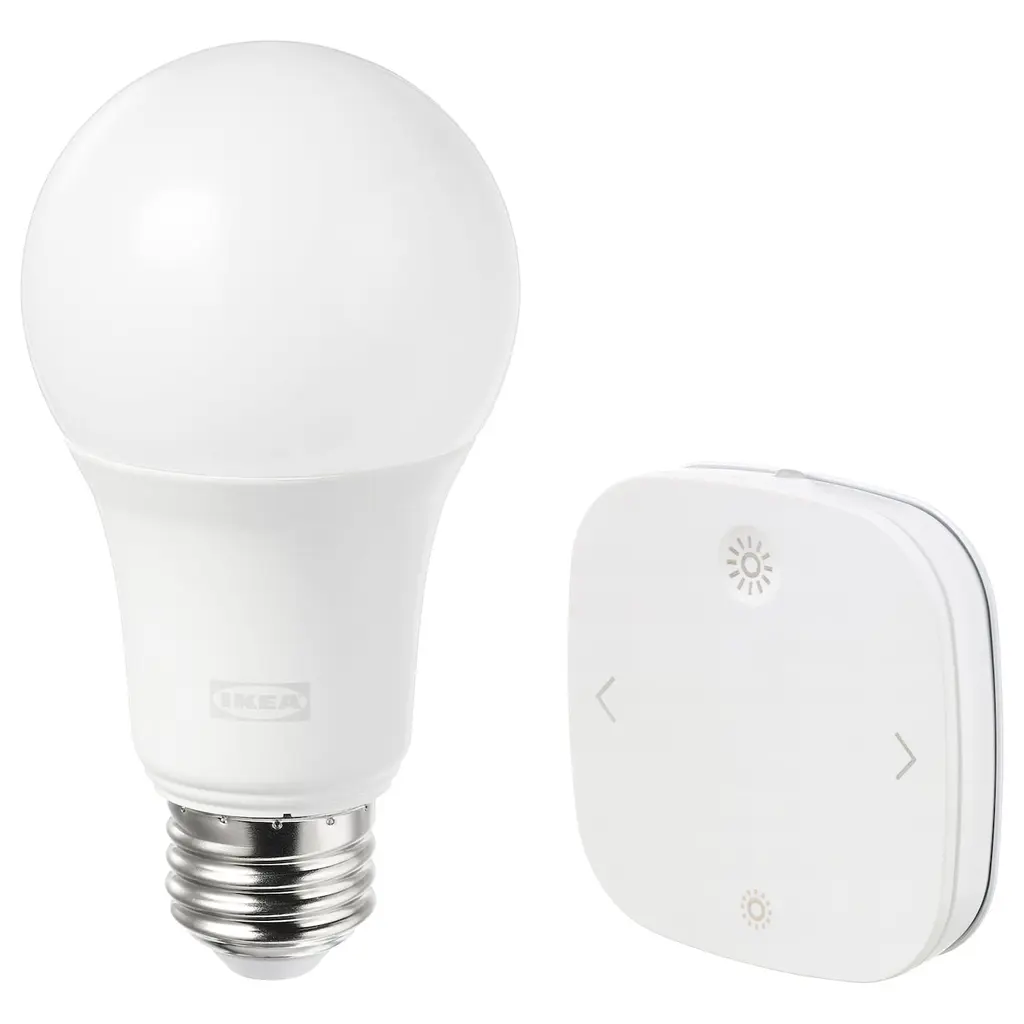 TRÅDFRI Remote control kit - smart wireless dimmable/color and white spectrum E26. This kit is already pre-paired, so all you have to do is screw the light source into the lamp socket and then start using your smart lighting. The remote control is tested and approved for bathroom use (IP44).