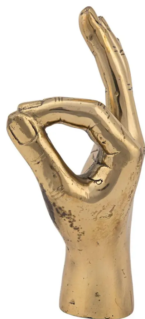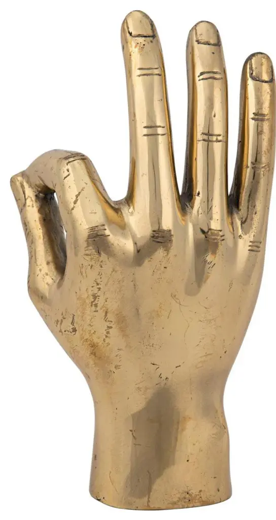 Elevate your decor with this exquisite Antique Brass OK Sign, an embodiment of traditional aesthetic allure and cultural charm. Crafted from a durable metal alloy with a gorgeous antique brass finish, this decor object stands out with its intricate detailing and luxury finish. At 9 inches tall and designed with excellent craftsmanship, this OK Sign is perfect for adding a touch of elegance and positive vibes to any space. Ideal as a statement piece, this beautifully polished brass object can be seamlessly integrated into your home or office. Its classic style makes it a versatile accessory for any interior design, whether you"™re aiming for a traditional, eclectic, or modern look. With a base width of 5 inches and a 4-inch depth, this figure is stable, making it perfect to be displayed on any flat surface. This charming OK Sign not only serves as a delightful decorative piece but also makes for a thoughtful gift for anyone with a penchant for iconic and traditional designs. Browning with elegance, this item"™s antique brass finish adds a touch of warmth and heritage, perfect for collectors and enthusiasts of fine decor items. - Dimensions: 9H 5W 4D - Material: Metal Alloy with Antique Brass finish - Color: Brass, Antique Brass - Style: Traditional - Subject: OK Sign