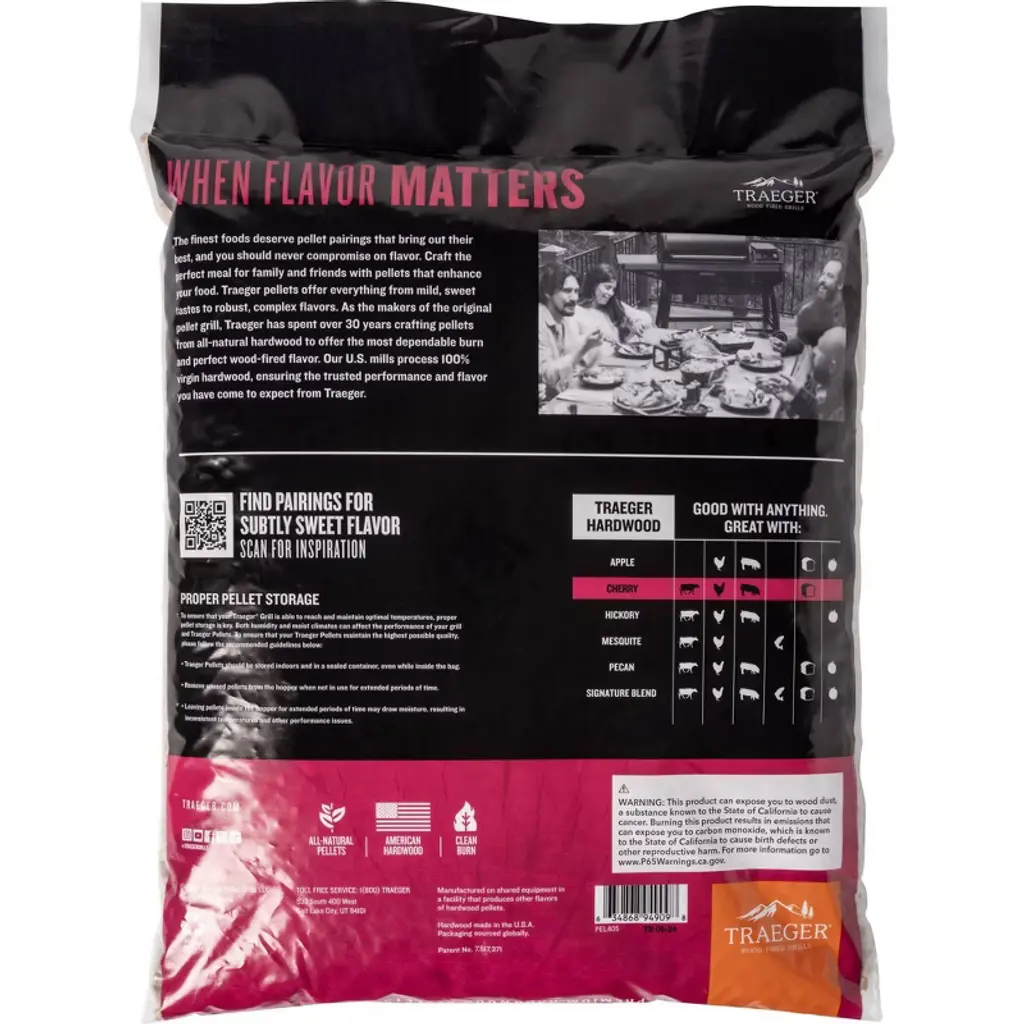 As the makers of the original pellet grill, Traeger has spent over 30 years crafting pellets from all-natural hardwood to offer the most dependable burn and perfect wood-fired flavor. Traeger’s premium wood pellets are made from 100% natural, BBQ quality hardwood. Our U.S. mills process 100% virgin hardwood, ensuring the trusted performance and flavor you have come to expect from Traeger. Traeger Cherry Hardwood Pellets enhance poultry, pork, and beef with just the right amount of subtly sweet, fruity flavor.