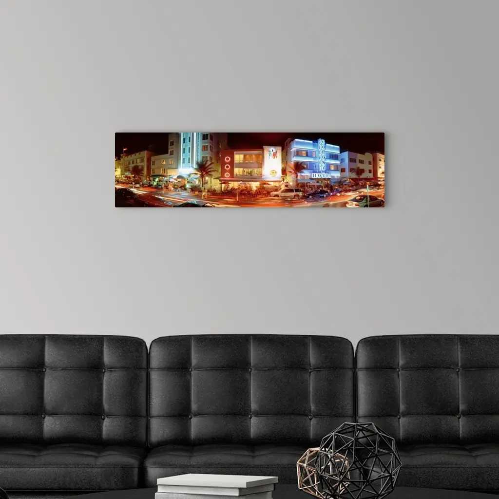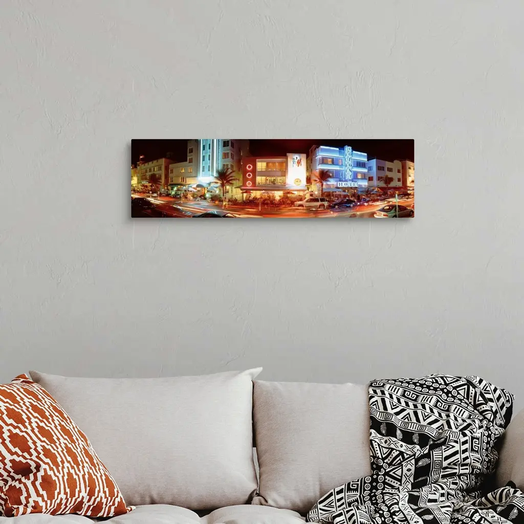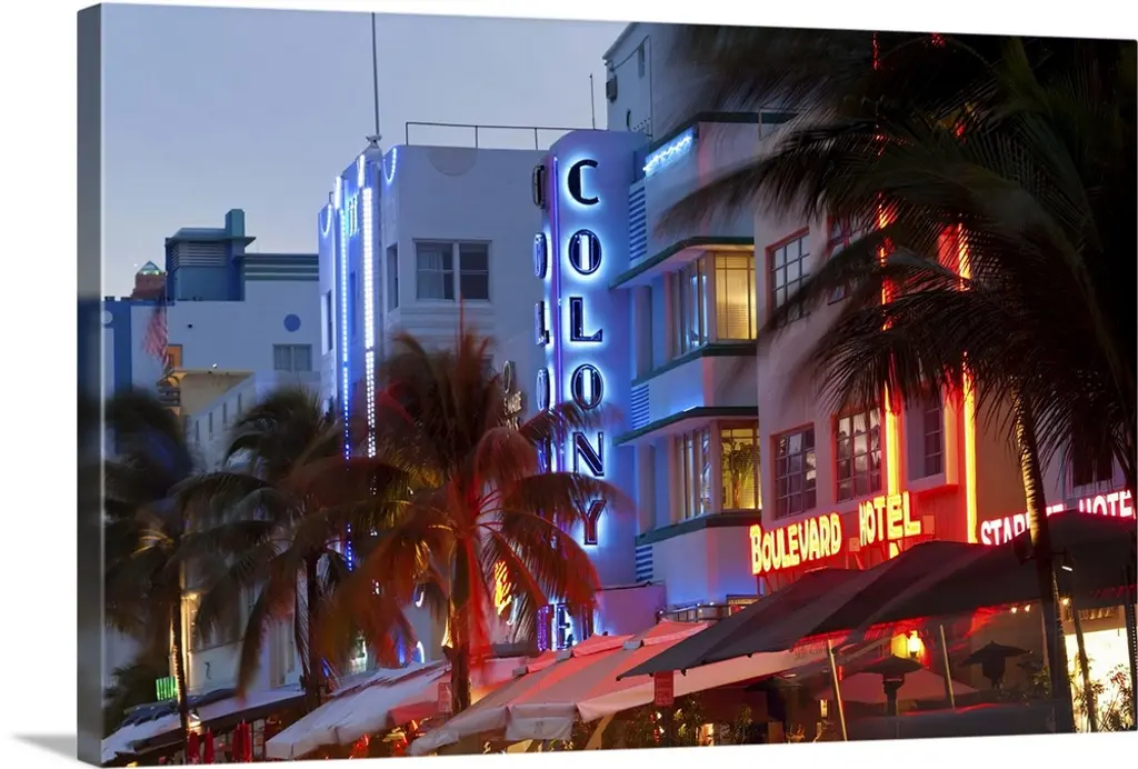 A panoramic view of the Art Deco buildings, neon lights and palm trees along Ocean Drive in Miami, Florida.