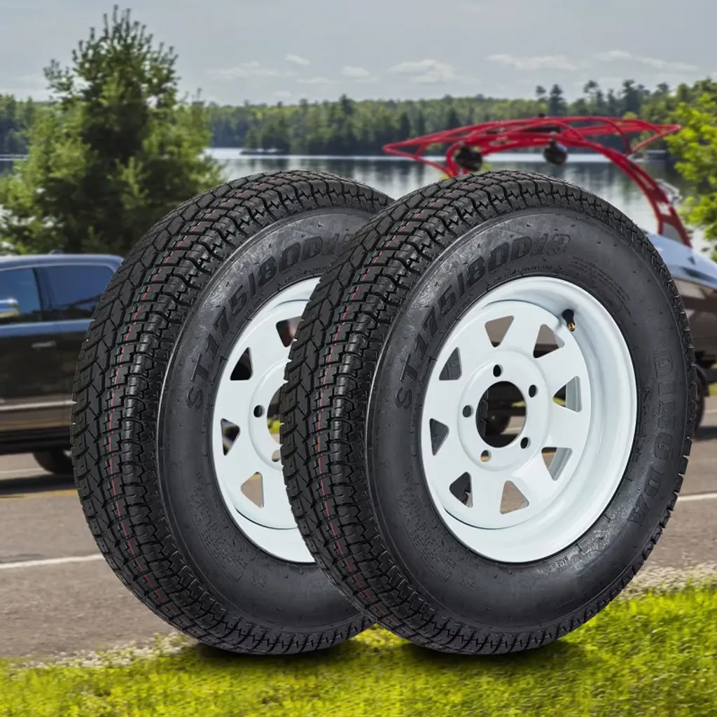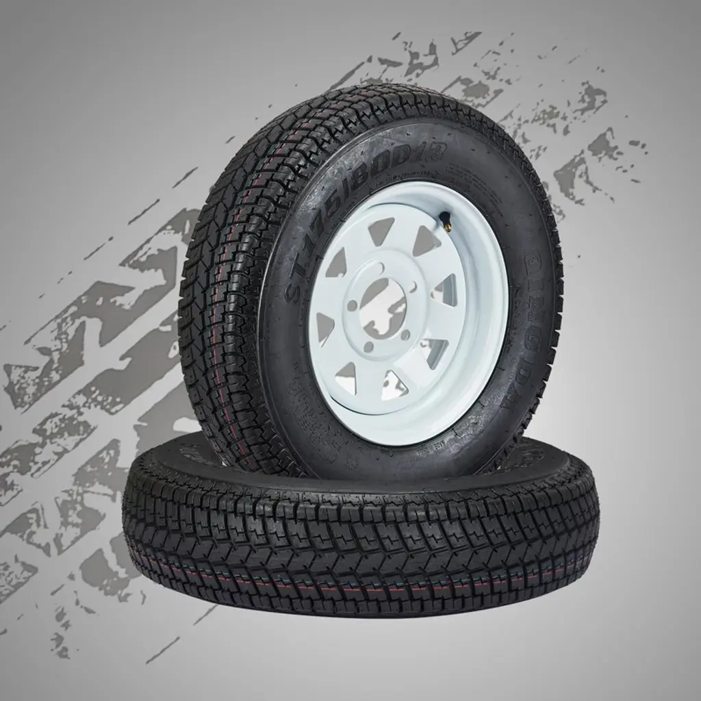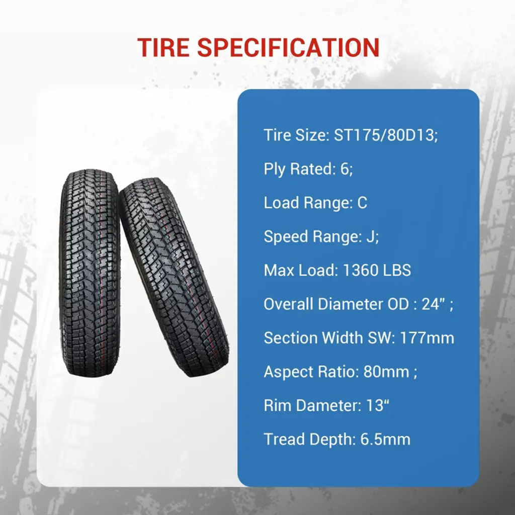 1.6-Ply Load Range C Construction: Heavy-Duty 1360 lb Load CapacityBuilt with a rugged 6-ply Load Range C design, this ST175/80D13 trailer tire on rim delivers exceptional load-bearing strength, supporting up to 1360 lbs per tire¡ªideal for heavy-duty towing needs. Whether you¡¯re hauling boat gear (anchors, coolers, life jackets), utility tools (lawnmowers, ladders), or camper supplies (bedding, cooking equipment), this tire handles the weight without sagging or compromising stability. Its precise dimensions¡ª24¡± overall diameter, 7¡± section width, and 6.5 mm tread depth¡ªensure a perfect fit for standard 13¡± trailer wheel wells, preventing rubbing against the trailer frame and maintaining consistent towing performance. The 6-ply structure also resists punctures from road debris (like gravel or sticks), reducing the risk of breakdowns during trips. 2.Pre-Mounted Ready-to-Install: No Hassle, Time-Saving SetupThis tire and wheel assembly comes fully pre-mounted on a durable 13¡± white spoke rim, eliminating the need for separate mounting tools or professional assistance. The rim features a standard 5-lug on 4.5¡± bolt pattern¡ªone of the most common configurations for boat, utility, and camper trailers¡ªso it¡¯s a direct replacement for worn or damaged tire-and-rim sets. Simply align the rim¡¯s bolt holes with your trailer¡¯s hub, secure with lug nuts, and you¡¯re ready to tow in minutes. This hassle-free design saves you time (no waiting for a shop to mount the tire) and money (no extra labor costs), making it perfect for last-minute repairs or quick upgrades. 3.Bias-Ply Design & 6.5 mm Tread: All-Weather Safety & TractionEngineered with a bias-ply construction (reinforced with cross-ply cords), this 13¡± trailer tire offers superior durability and load distribution¡ªcritical for trailer tires that bear weight evenly across the tread. The 6.5 mm deep tread pattern enhances grip on both wet and dry surfaces: on rainy days, the tread channels water away from the tire¡¯s contact patch to prevent hydroplaning; on dry roads or gravel paths, it provides strong traction to reduce trailer sway (a common cause of towing accidents). This all-weather performance means you can rely on it year-round¡ªwhether you¡¯re towing a boat to the lake in summer, a utility trailer with firewood in fall, or a camper for a winter getaway¡ªwithout sacrificing safety. 4.Versatile Compatibility: Ideal for Multiple Trailer TypesThis ST175/80D13 tire and wheel assembly is tailored to work seamlessly with a range of popular trailer models:Boat trailers: Resists the effects of water exposure (like rust on the rim and tire degradation from moisture) while supporting the weight of boats and marine gear. Utility trailers: Handles the rough-and-tumble use of hauling tools, landscaping materials, or small equipment, with the 6-ply build standing up to bumps and debris. Campers & travel trailers: Delivers a smooth, stable ride for long-distance trips, reducing vibration that can damage camper interiors or make towing uncomfortable.Its universal ST175/80D13 size (a standard for light-to-medium trailers) ensures it fits most makes and models, making it a versatile solution for all your towing needs. 5.Rust-Resistant White Spoke Rims: Long-Lasting DurabilityThe 13¡± white spoke rim is treated with a rust-resistant coating, protecting it from harsh environmental elements that plague trailer rims¡ªlike saltwater (for boat trailers), road salt (for winter towing), and humidity (for outdoor storage). The white finish not only adds a clean, classic look to your trailer but also hides minor dirt and scuffs, keeping the rim looking neat even after frequent use. Unlike uncoated steel rims that rust quickly, this design maintains its structural integrity and appearance for years, reducing the need for frequent rim replacements. Whether your trailer is stored outdoors or used in wet conditions, the rust-resistant rim ensures reliable performance trip after trip.