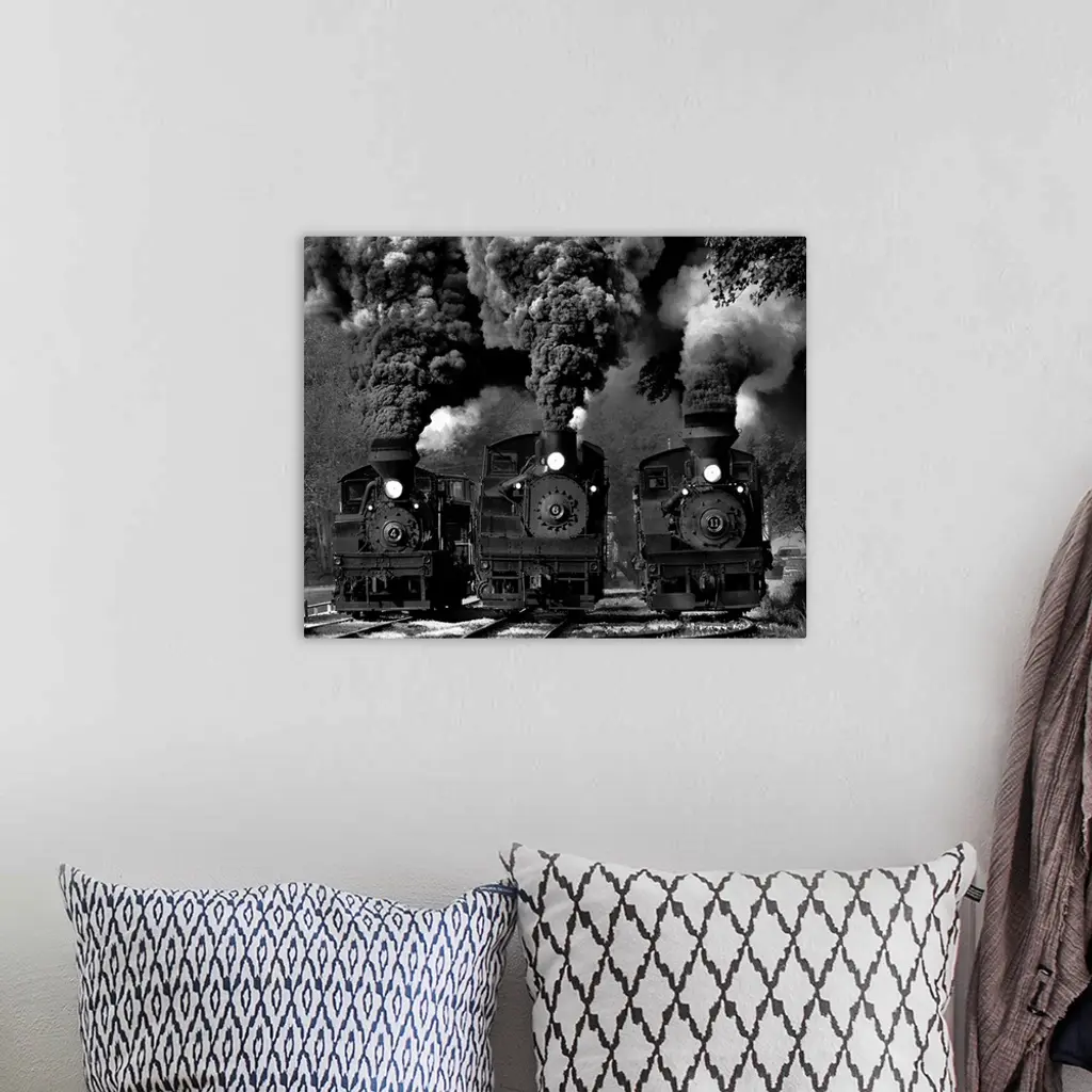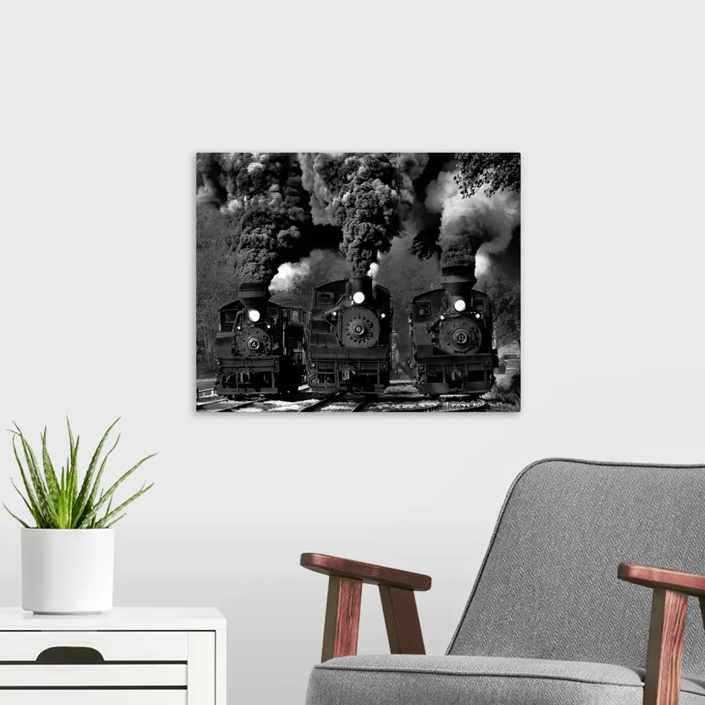 Three locomotives rolling down the tracks with large clouds of smoke coming from their smokestacks.