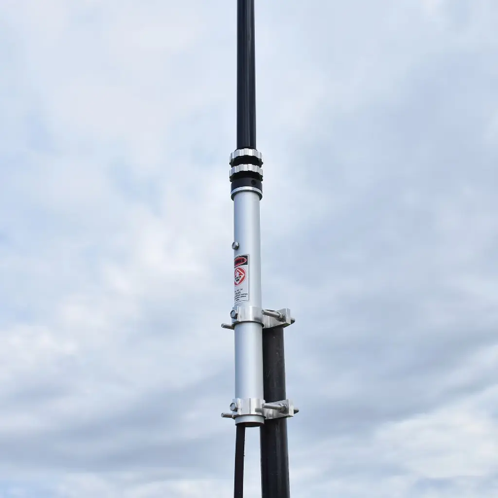 Made of heavy-duty black fiberglass, the Tram Tram 18 Ft. Black CB Base Antenna with 26 MHz to 31 MHz 5.75 dBd Gain comes with twin tuning rings for fine tuning capabilities and provides omnidirectional coverage for optimal transmission and reception. It stands 18 ft. tall and comes in 3 sections for easy installment. A mounting bracket with stainless steel hardware is included.