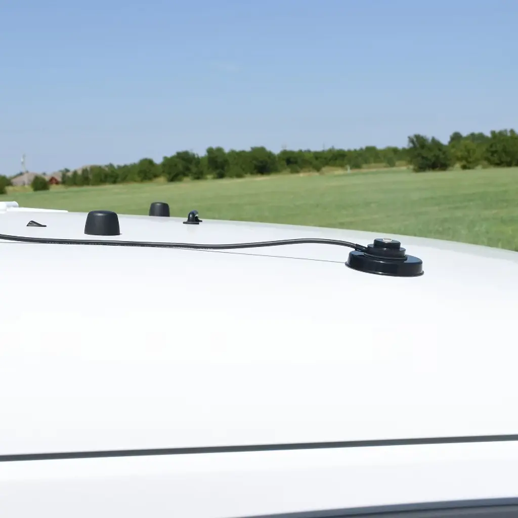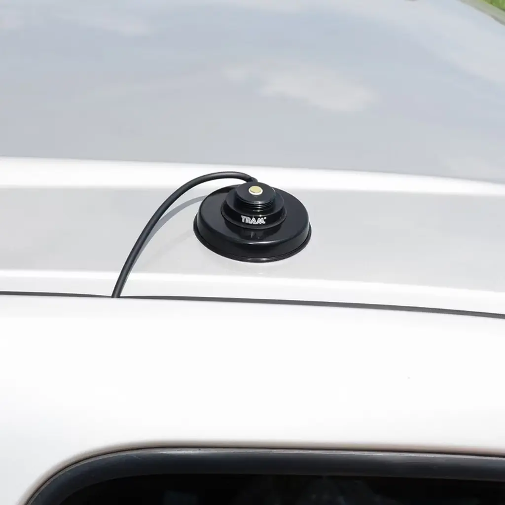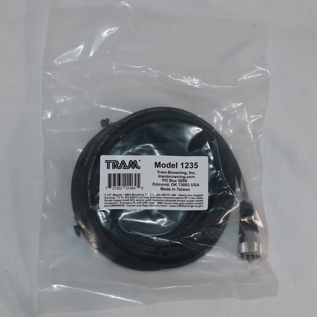 The 3-1/4 In. NMO Magnet Mount from Tram features a gold contact pin and 17 ft. RG58 coaxial cable with copper stranded center conductor and a UHF/PL-259 connector. The magnet housing is made from black zinc._