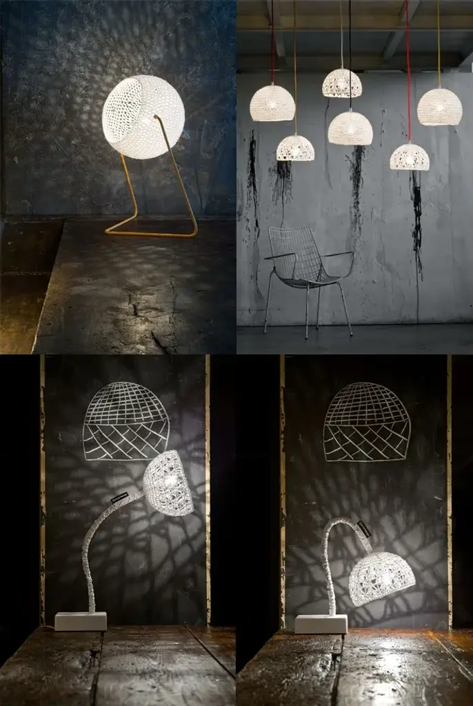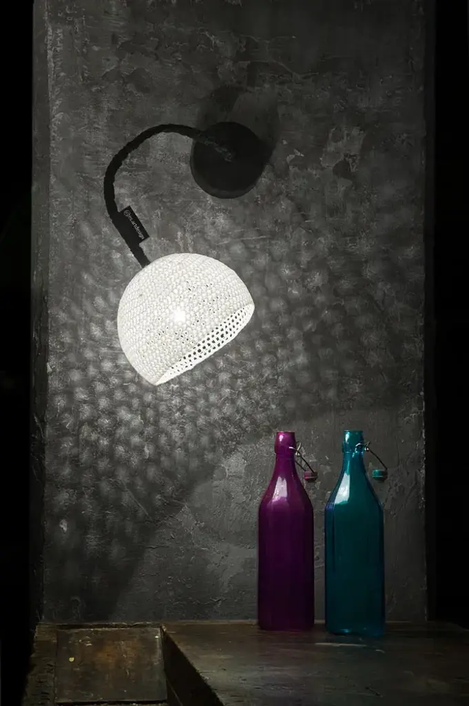 Part of the lamps are characterized by an entirely handmade knitted fabric structure, made solid and fire-resistant by resin. Thanks to this expedient, the hat maintains the look of knitted textile, but if touched, it is solid and resistant. The atmosphere that the lamp gives the room, by creating a suggestive “crochet effect” of light and shadow, is extraordinary, cozy and intense. It is possible to color the suspension by choosing one of the tints proposed for the viscose, covering the electrical wire (blue, red, yellow, gold, white, fluorescent orange).There is another proposal dedicated to the wall lamp and table lamp models of this collection. It consists of a nylon covering, white or black, with a silicon name tag of the logo, that “dresses” the flexible tube. This “flexible arm” can be moved, to project the light where you prefer.The new collection Trame, designed by the artist/ designer Oçilunam for In-es.artdesign, is a family of lamps created with handcrafted techniques, typical of designer clothing.