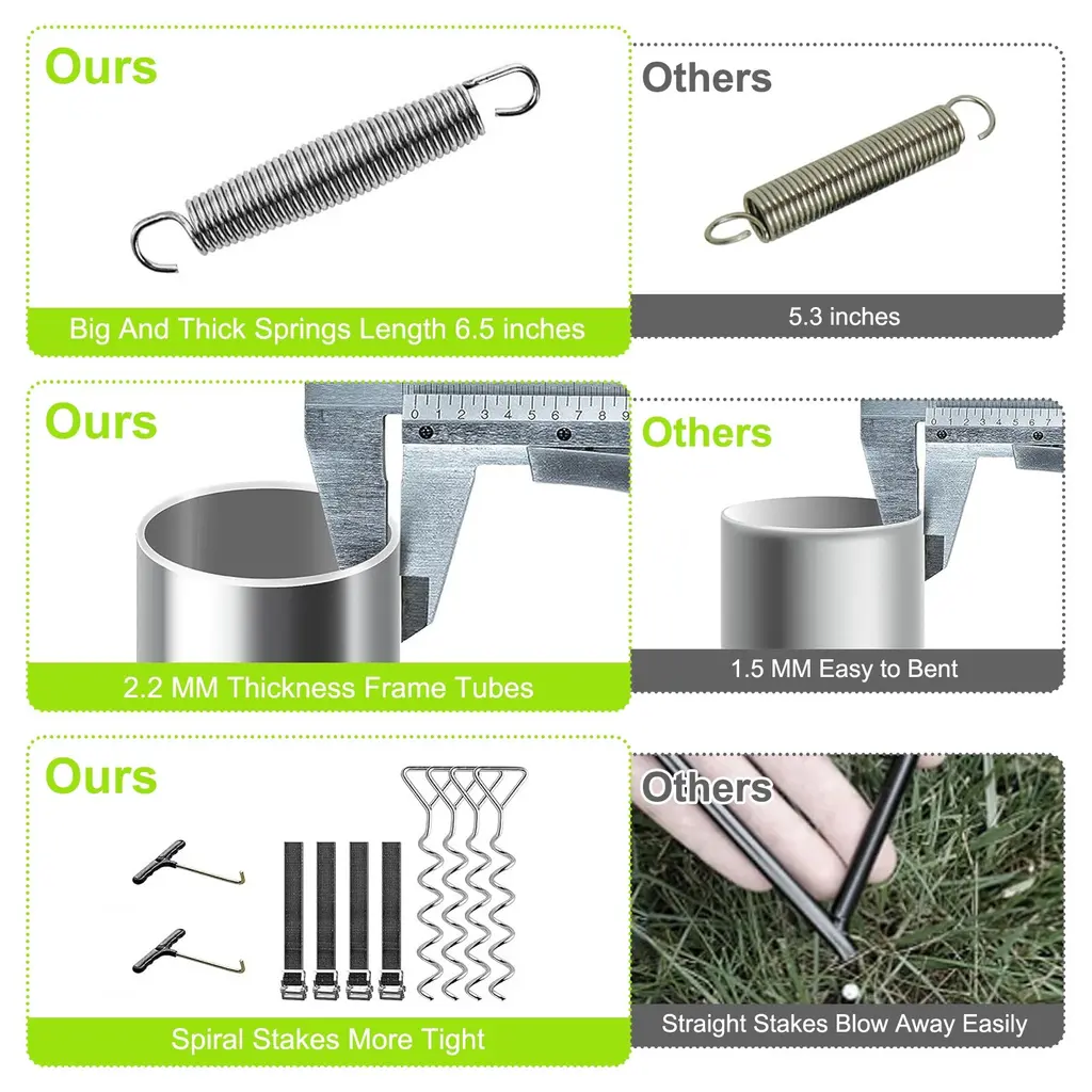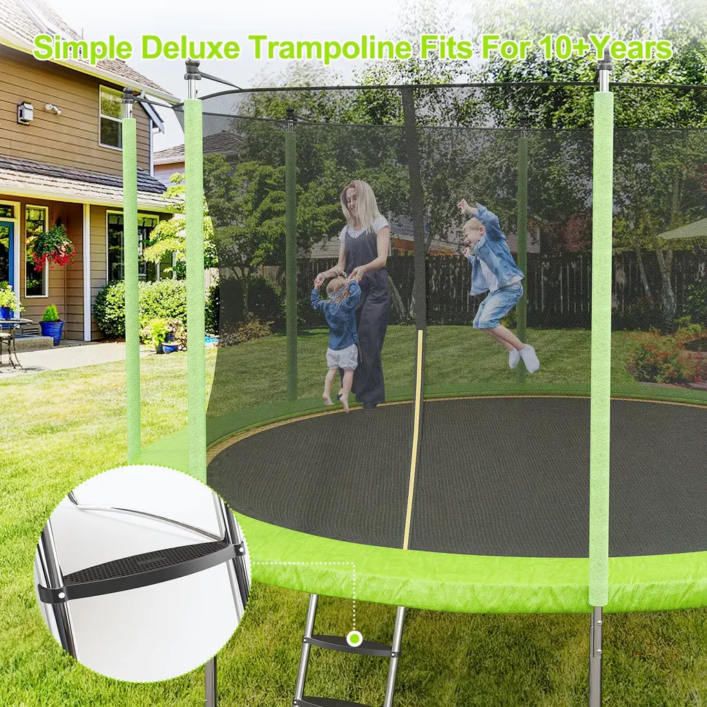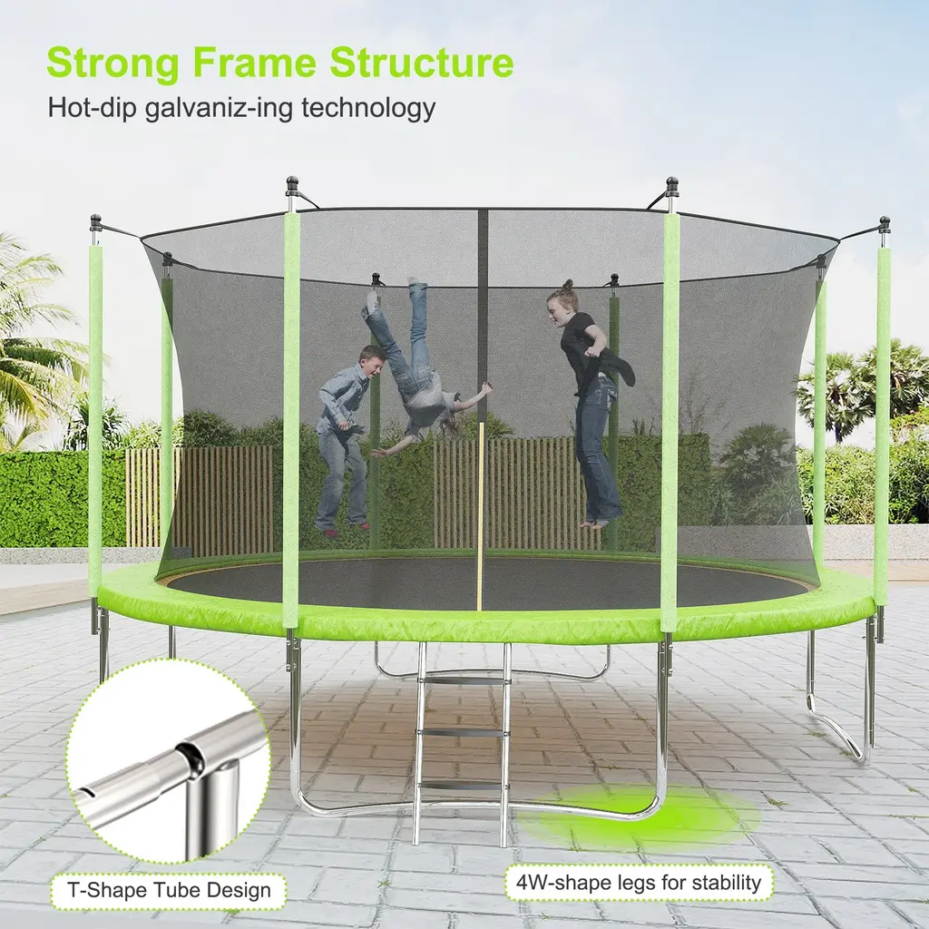 【Security Certification】The trampolines, Surpassing ASTM 381/ASTM F2225-15 Standard Safety Specification , CPC, ISO, and BSCI approved. We have designed safety devices for our trampoline. The jump pad and spring cover are tightly attached to prevent the soles of your feet from getting caught in the springs during use. 【Hot-dip Galvanizing Technology & Heavy-duty Frame】The trampolines use the latest hot-dip galvanizing technology to make the frame anti-rust, more stable and durable. Additionally, our trampolines feature 2.2mm steel frame tubes, surpassing the 1.5mm thickness of ordinary frames, ensuring enhanced sturdiness. The static load capacity is 1600 LBS, and the dynamic load capacity: 440 LBS. 【Comfortable Jumping】Sturdy galvanised springs securely connect the tightly woven jumping mat to the frame, providing a comfortable bounce for an even more bouncy and springy jump. More sturdy U-shaped legs with more balanced contact points add stability to the trampoline. 【Higher Quality Materials for Max Safety】Wear-resistant trampoline jumping mat, thickened rust-proof steel material, the trampoline will not fade when used outdoors. Our 10ft 12ft 14ft 16 ft trampoline for kids has been tested for 100,000 jumps. Mats are tested up to 6,000 hrs and can hold up to 440lbs. Kids can jump and exercise safely and happily! 【Unbeatable Warranty】Our unbeatable warranty: 10 Years for Frame, 2 Years for Jumping Mat & Safety Pad & Enclosure Net & Springs, and free replacement for other parts. We are committed to providing double protection for your purchase.<