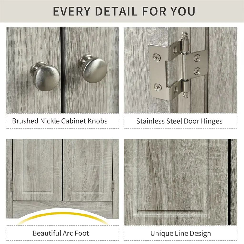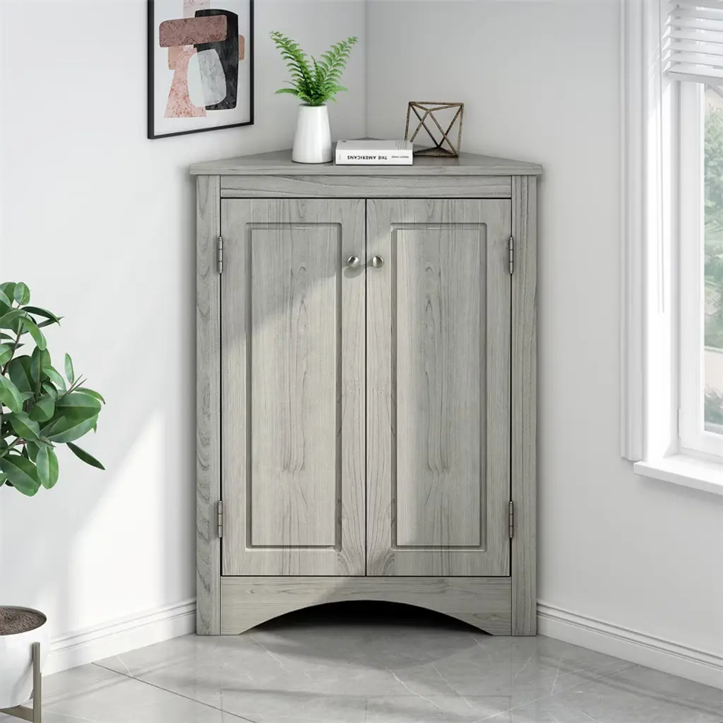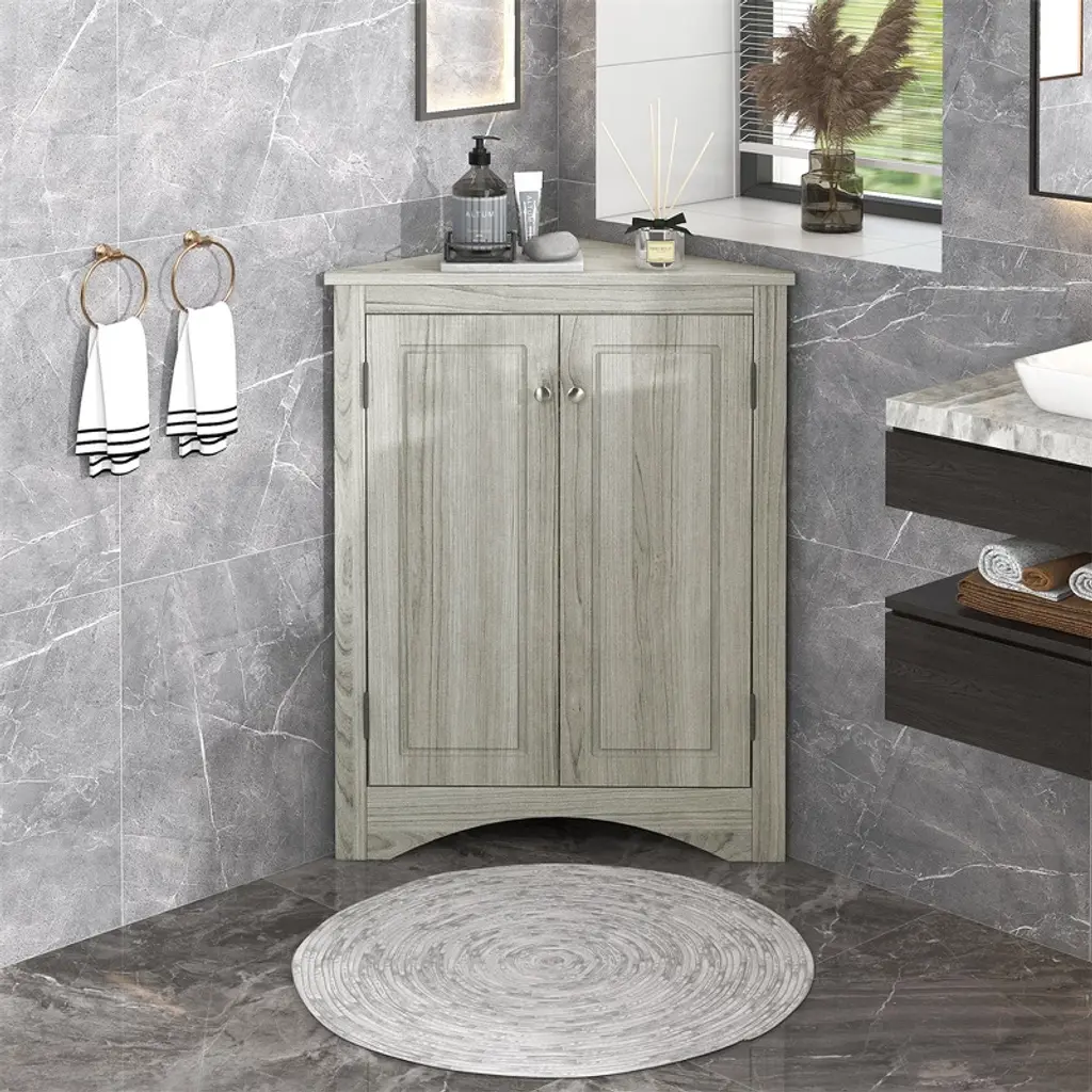 Maximize your corner space with this triangular storage cabinet featuring adjustable shelves to customize storage for towels, toiletries, or kitchen essentials. The sleek freestanding design blends functionality with modern aesthetics, while the brushed nickel knobs add a refined touch. Perfect for small bathrooms, kitchens, or laundry rooms to keep items organized yet easily accessible.