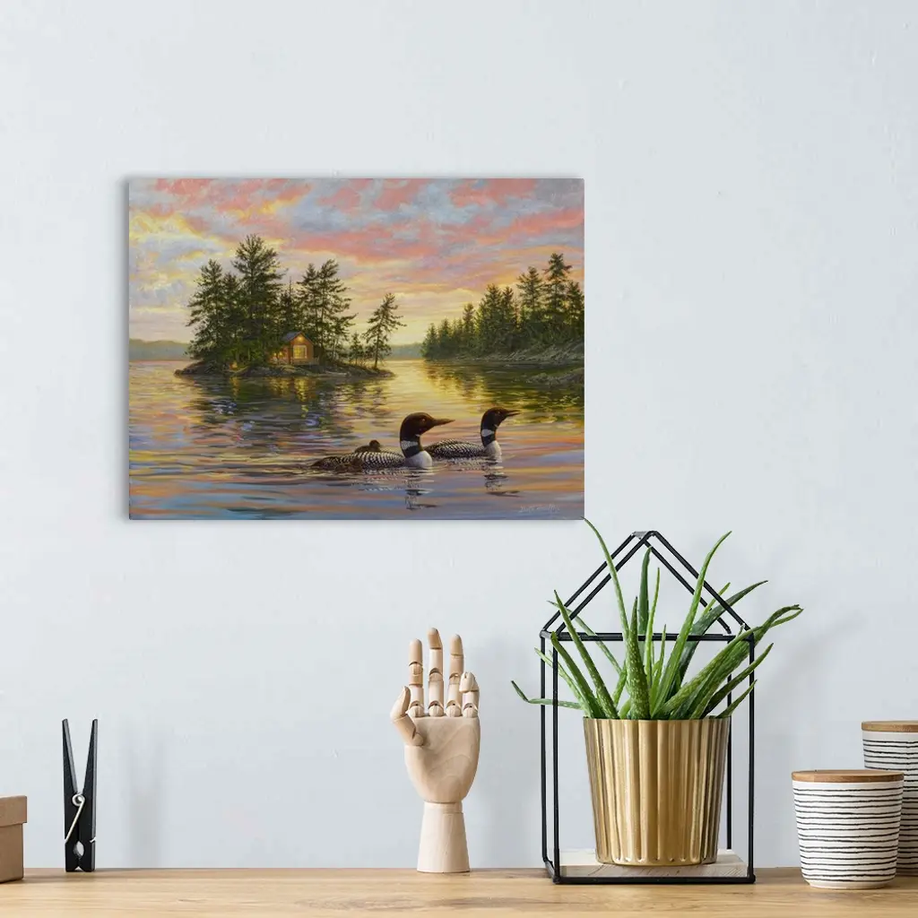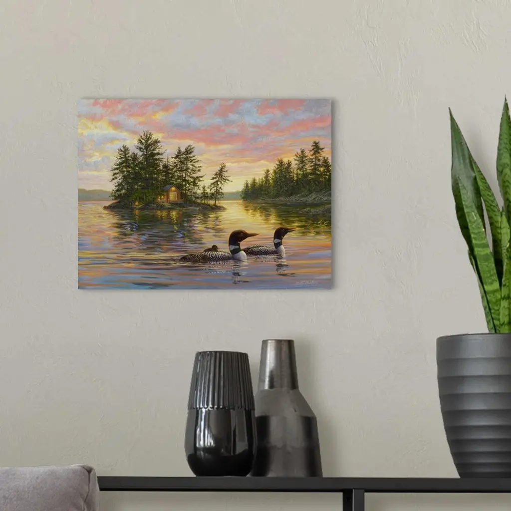 Tranquil Evening - Loons wall art for home and office decor. Discover canvas art prints, photos, mural, big canvas art and framed wall art in GreatBigCanvas.com's varied collections.