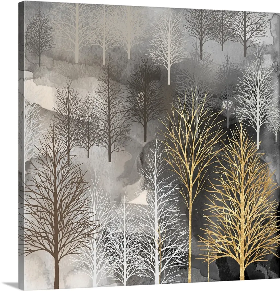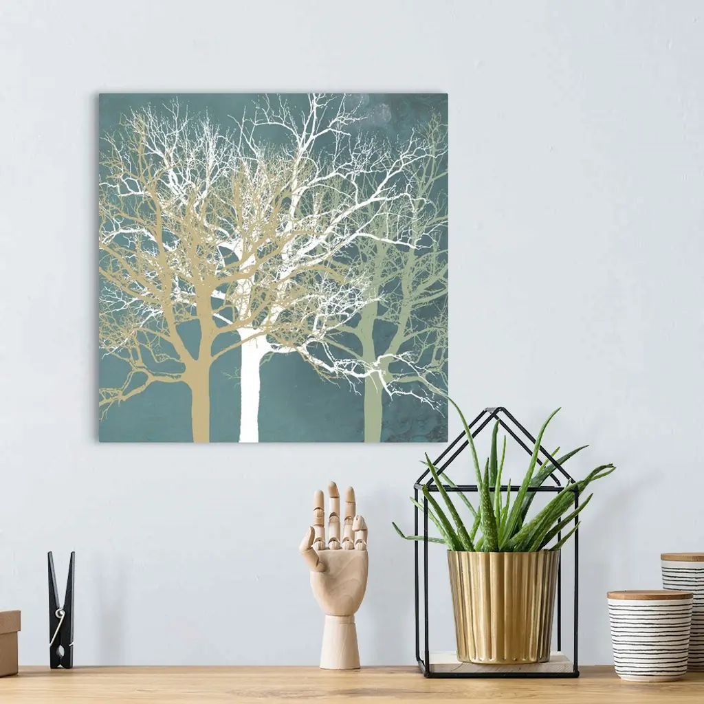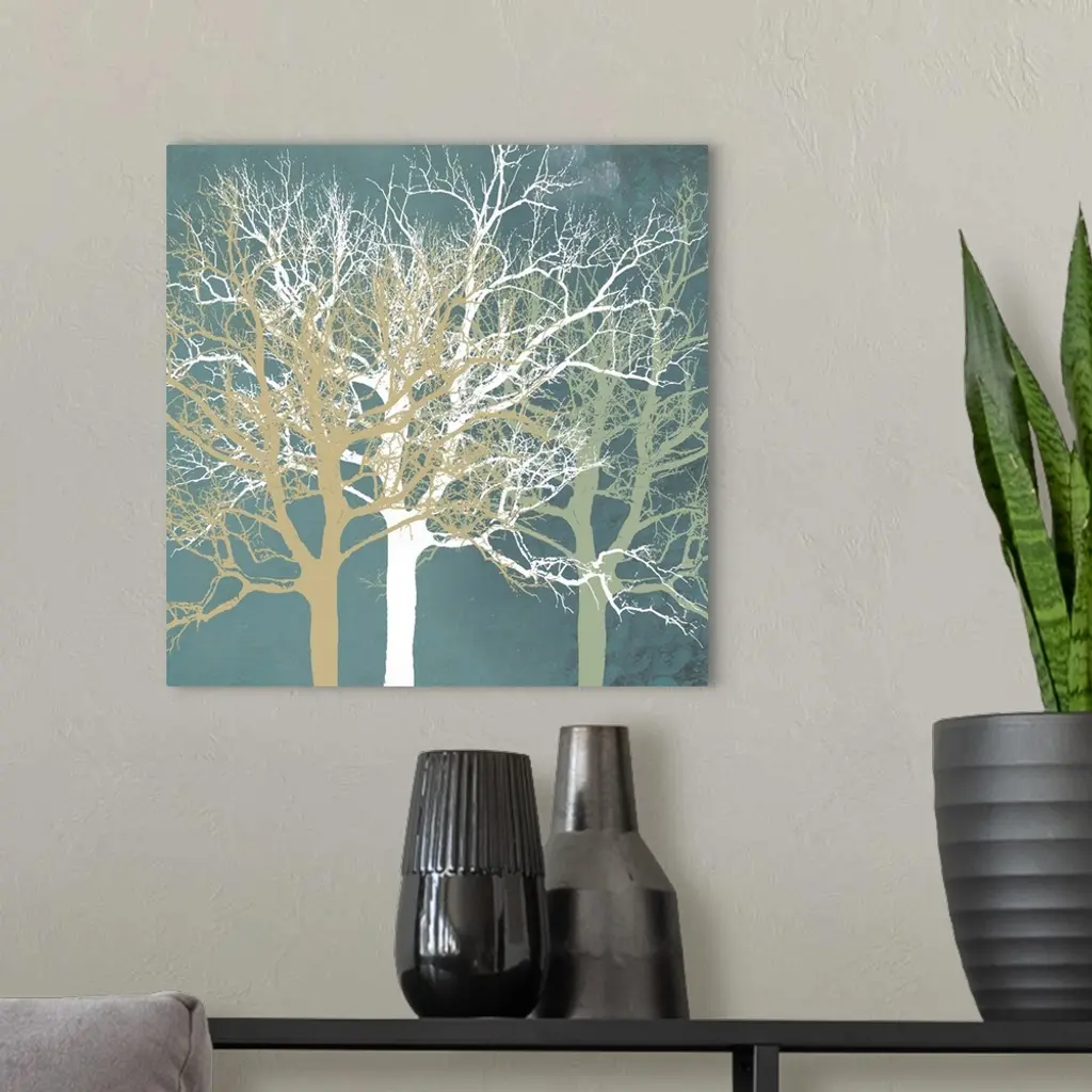 Flat silhouettes of three different colored trees are imposed over a textured, contrasting background.