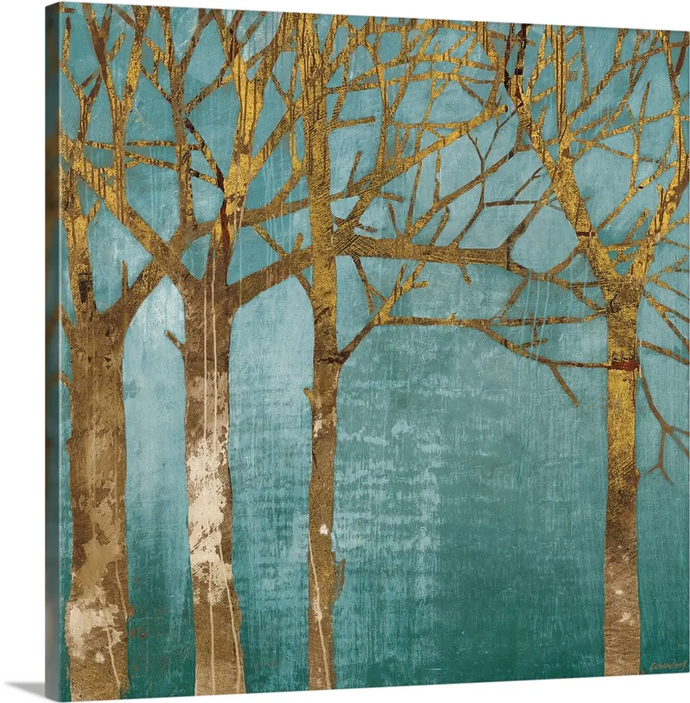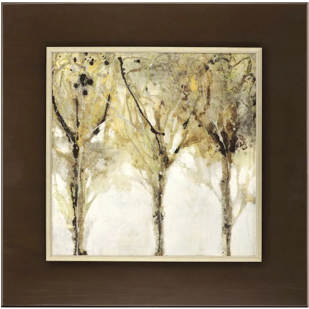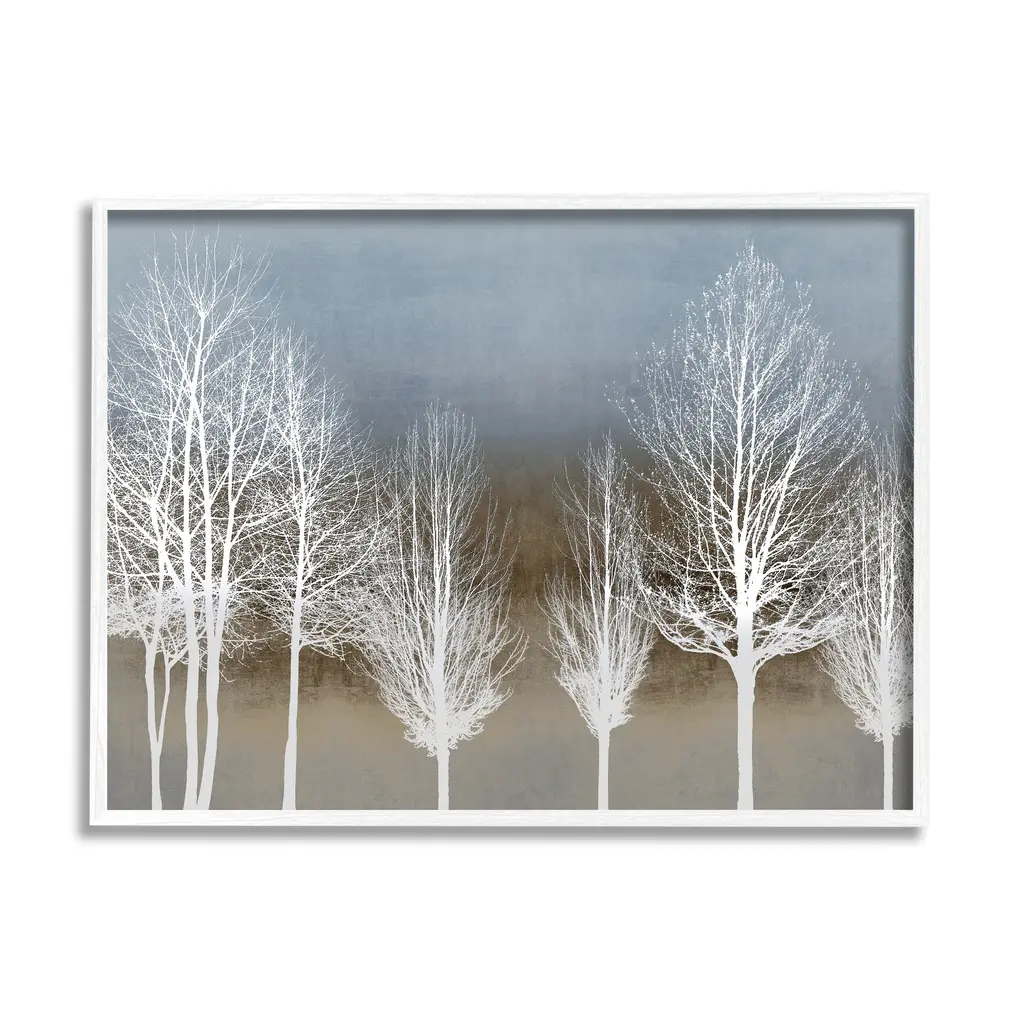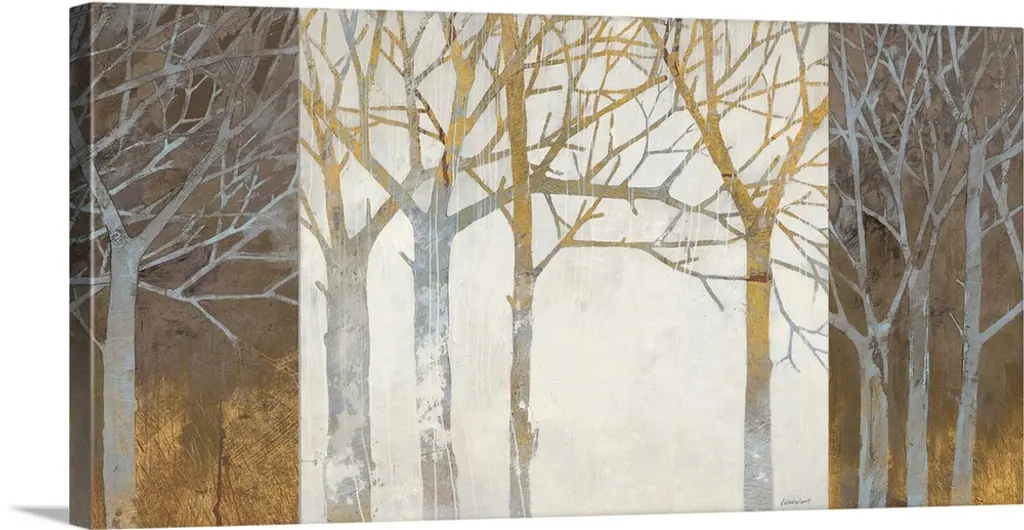 Flat silhouettes of three different colored trees are imposed over a textured, contrasting background.