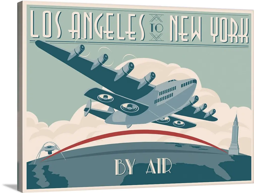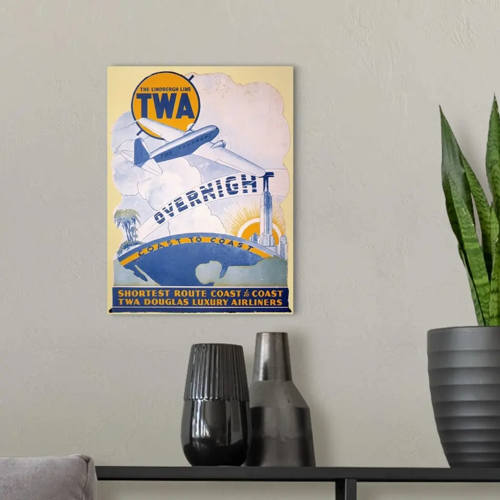A 1934 Trans-World Airlines poster introducing the new Douglas DC-2 on transcontinental routes.