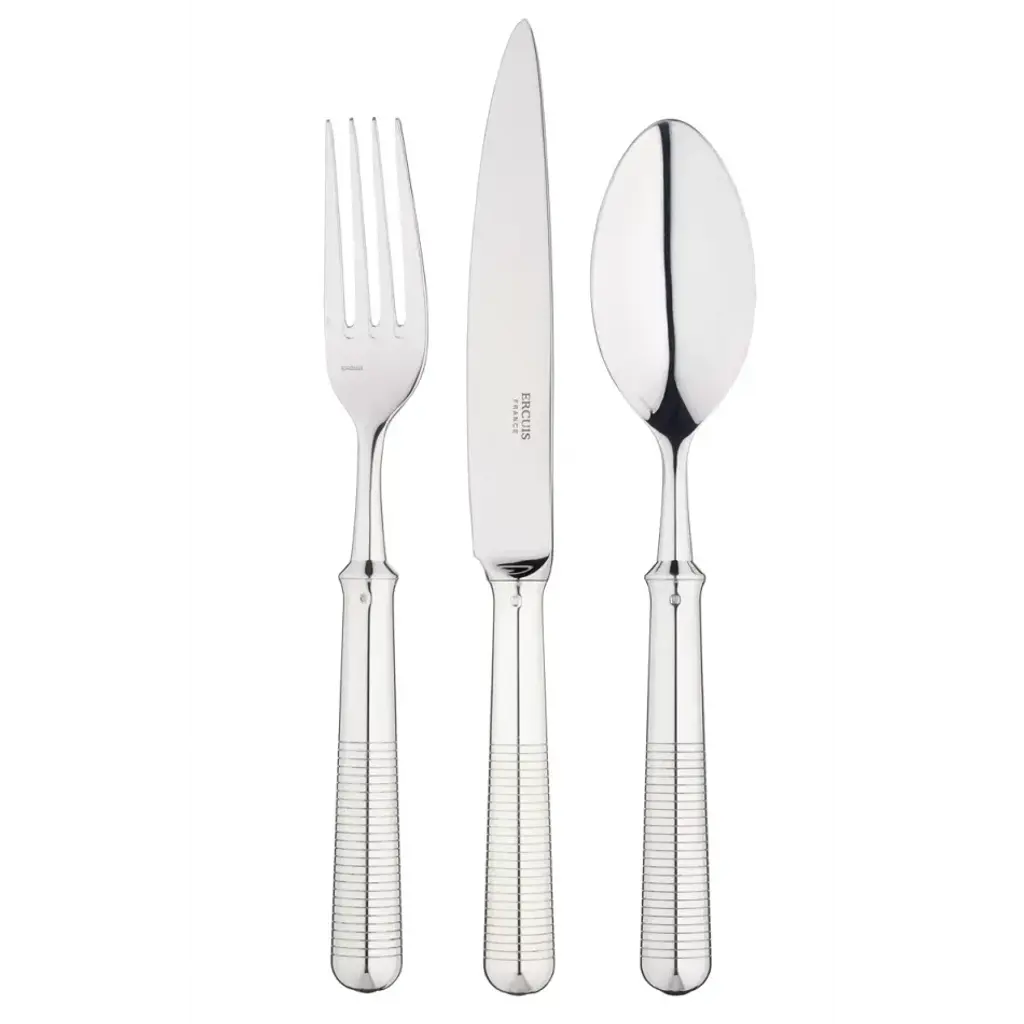 Classic silverplated flatware, pared down to the essentials and then transected with horizontal lines to create a unique look. Since 1867, Ercuis has produced fine silverware used in embassies, yachts, and luxury hotels around the world. Founded by a French priest, Adrien Céleste Pillon, Ercuis originally created silver items for use in church services. The factory quickly branched out into dinnerware and silverware for royal houses as well. Today, Ercuis carries on the tradition through the works of craftsmen who care about quality, detail and passion. At 63 microns, the silverplating used in the Ercuis flatware collections is almost double the industry standard. In addition, the company's specialized plating machinery places an extra deposit of silver on all the areas of the cutlery that get the most wear.
