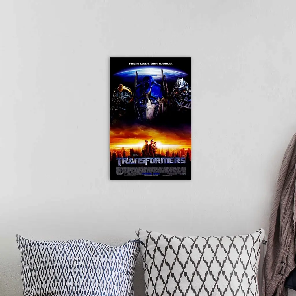 Movie poster for the first Transformers film with the three main auto bots pictured above the city where their battle ensues and the tagline "Their War. Our World".