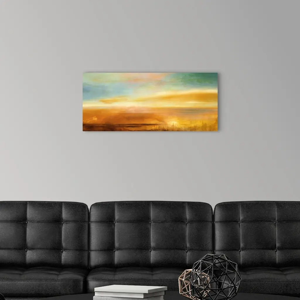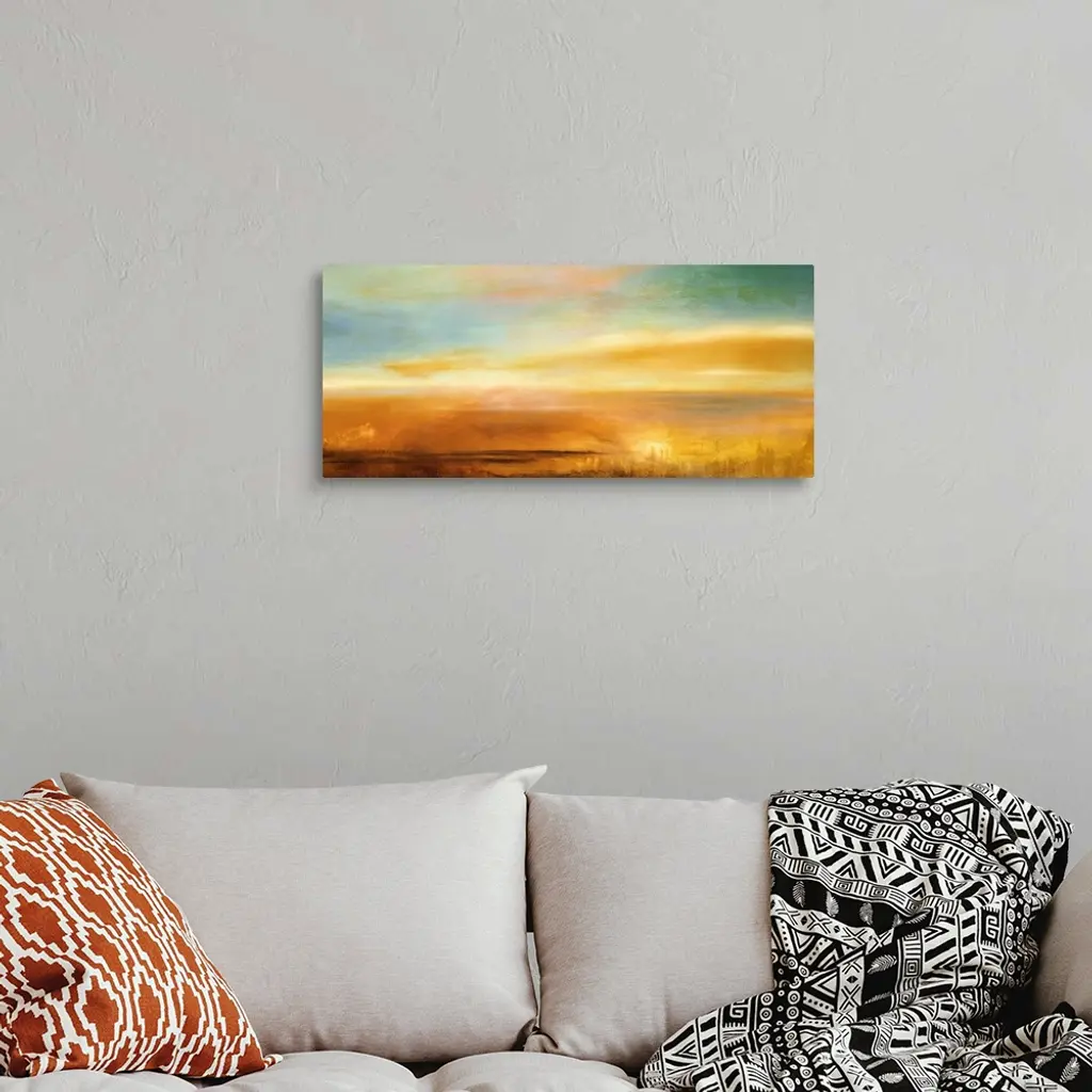 This contemporary piece consists of warmer tones throughout the piece and a blue, cooler sky above.