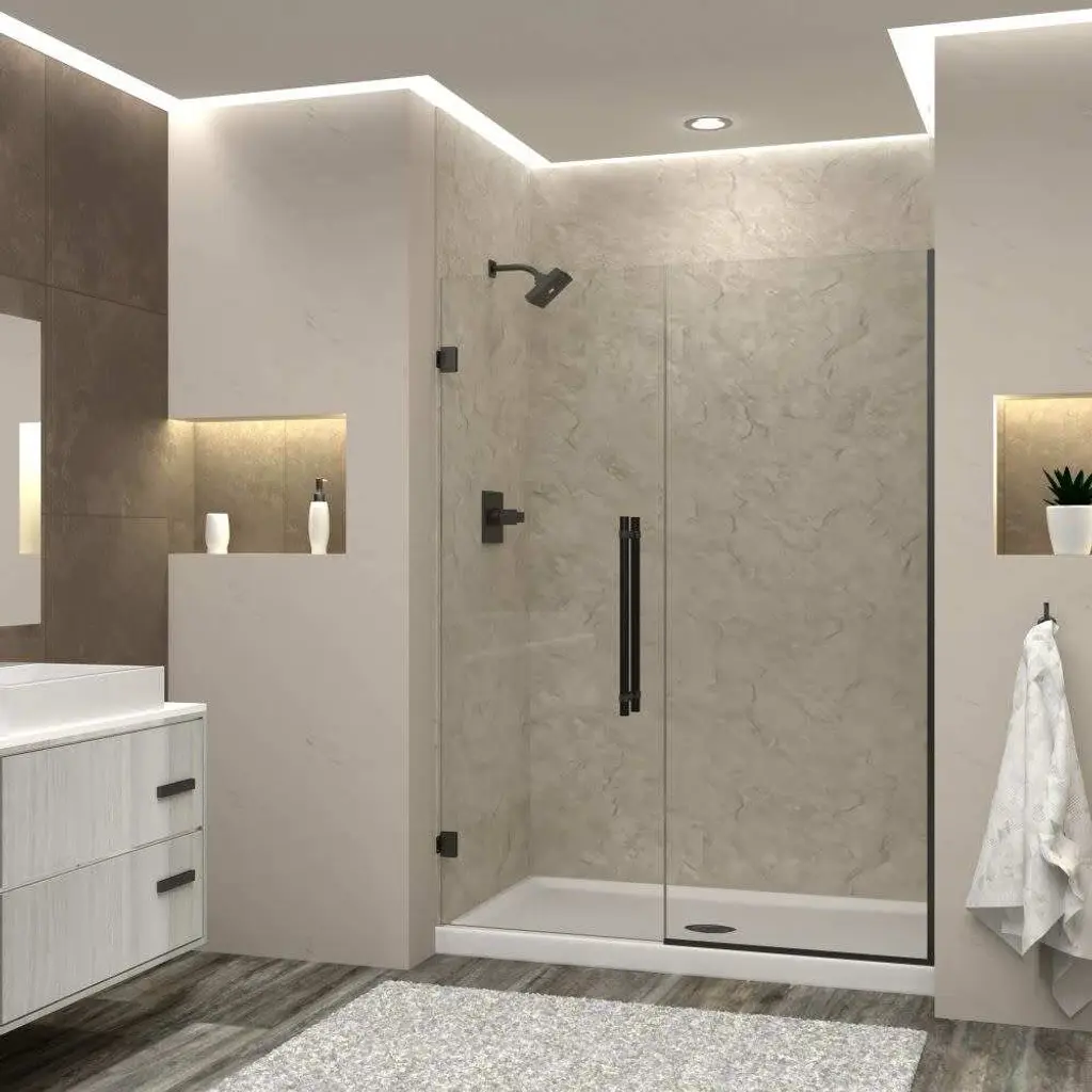 The Transolid Elizabeth shower door is a frameless hinged shower door that is every bit as elegant as it is functional. TruMotion, additional height and width adjustment for out of plumb walls is what sets the Elizabeth door apart from its competition. This unique TruMotion slow closing hinge features an adjustable 3 position timing, enabling the user to adjust the closure from either slow or fast paced closing without having to worry about a slamming door. A clear vinyl seal allows for a 3/8-in out of plumb adjustment, making it possible for uneven walls to still hold a beautiful shower door. Transolid exclusive Nano ClearCoat water repellant and stain resistant glass coating adds superior protection from stains and is nearly maintenance-free. With clean lines, modern accents and an upscale look, the Elizabeth collection adds timeless style to any bathroom space.Transolid EHTA277610C-BK Features:Transolid EHTA277610C-BK Specifications: