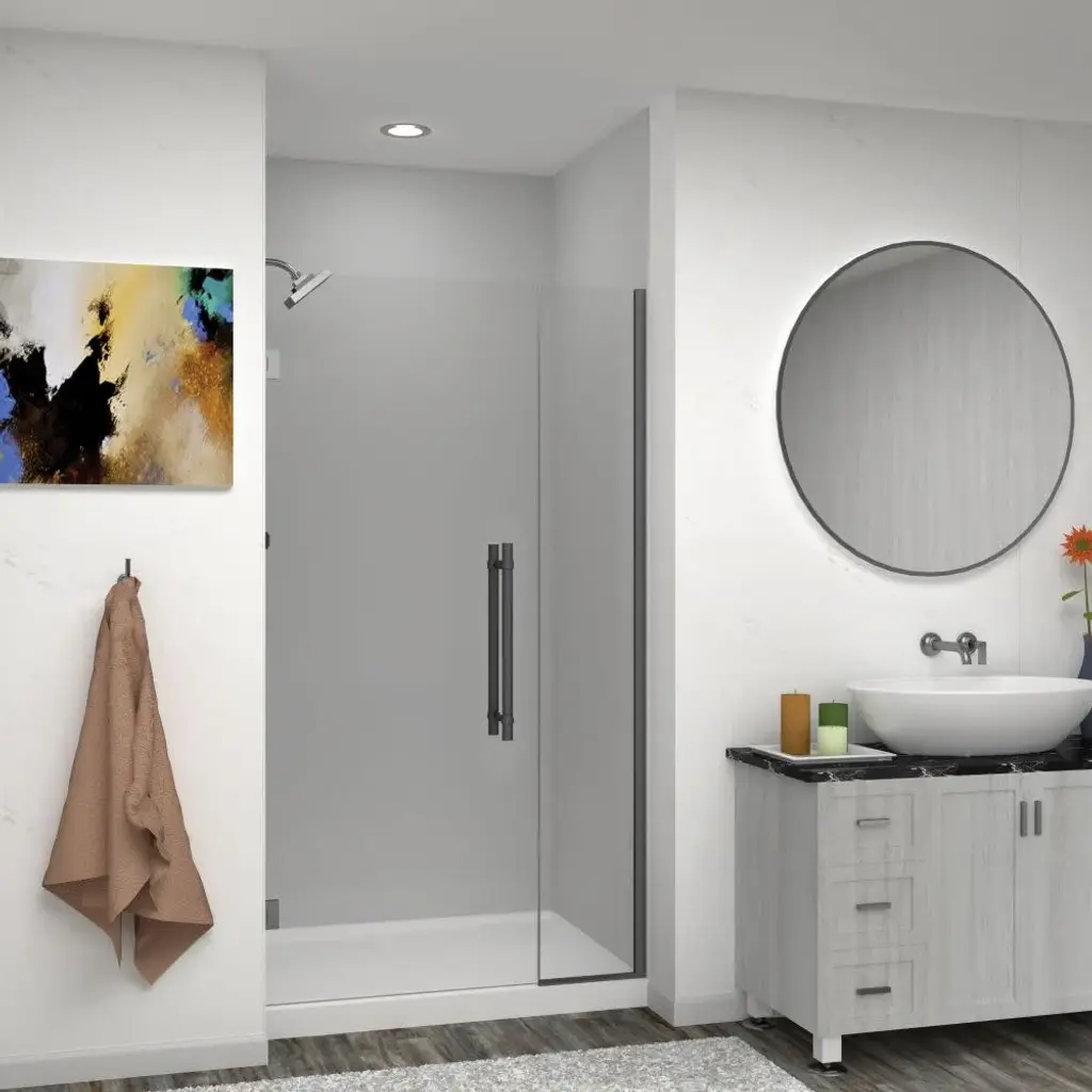 This Transolid Elizabeth shower door has a frameless swing shower door with a fixed panel that is every bit as elegant as it is functional. TruMotion and additional height sets this Elizabeth door apart from its competition. This unique TruMotion slow closing hinge features an adjustable 3 position timing, enabling the user to adjust the closure from either slow or fast paced closing without having to worry about a slamming door. The side wall profile on the stationary panel allows 1/2" out-of-plumb adjustment, making it possible for uneven walls to still hold a beautiful shower door. Transolid exclusive Nano ClearCoat water repellant and stain resistant glass coating adds superior protection from stains and is nearly maintenance-free. With clean lines, modern accents and an upscale look, the Elizabeth collection adds timeless style to any bathroom space.Transolid EHTB305247610C-T Features:Transolid EHTB305247610C-T Specifications:
