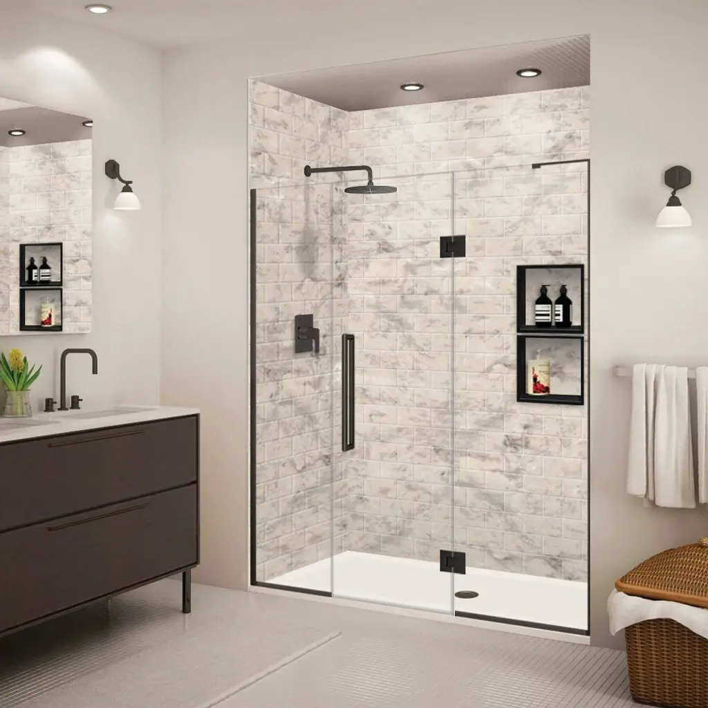 This Transolid Elizabeth shower door has a frameless swing shower door with a fixed panel that is every bit as elegant as it is functional. TruMotion and additional height sets this Elizabeth door apart from its competition. This unique TruMotion slow closing hinge features an adjustable 3 position timing, enabling the user to adjust the closure from either slow or fast paced closing without having to worry about a slamming door. The side wall profile on the stationary panel allows 1/2" out-of-plumb adjustment, making it possible for uneven walls to still hold a beautiful shower door. Transolid exclusive Nano ClearCoat water repellant and stain resistant glass coating adds superior protection from stains and is nearly maintenance-free. With clean lines, modern accents and an upscale look, the Elizabeth collection adds timeless style to any bathroom space.Transolid EHTB55257610C-BK Features:Transolid EHTB55257610C-BK Specifications: