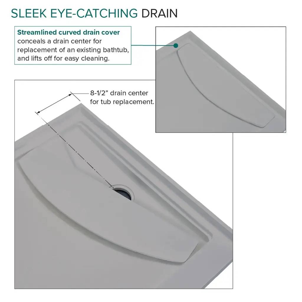 Upgrade your bathroom effortlessly with Transolid FSL-Series shower bases featuring an 8.5-in drain center location for direct tub replacement, converting a bathtub space into a spacious 60-in shower. A modern touch with a sleek aesthetic for effortless entry and exit. Transolid's bases are crafted from solid material cast as a single piece, ensuring durability and consistency throughout. With a super dense construction, they are both easy to repair and soft to the touch.Transolid FSLB6032L Features:Transolid FSLB6032L Specifications: