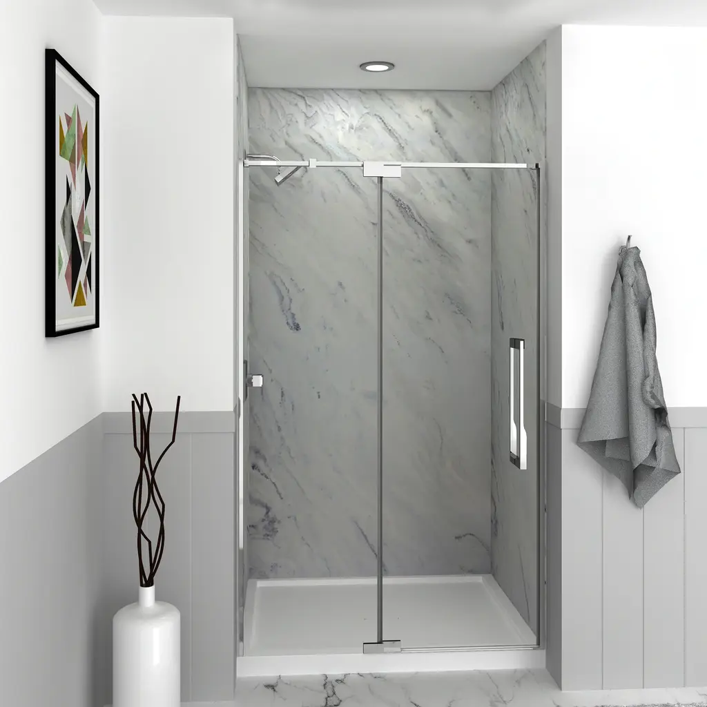 The Transolid Irene Pivot Shower Door Collection combines the practicality of a space saving design with custom quality craftsmanship. The collection features thick, premium 3/8 in. (10mm) clear tempered glass with professionally applied Nano clear glass coating, which provides superior dirt and water repellant and stain resistant benefits. The Irene door provides up to 1/4 in. of out-of-plumb adjustability on each side to provide a watertight fit in your alcove. The Irene Door is available in several different width, height and color combinations to match your bathroom's interior design and layout perfectly. Built for an alcove (3-wall) shower enclosure, pivot shower doors can be installed to open from the left or right with one panel remaining fixed. Multiple Transolid handle options are available, but this combination features the Justin handles, a unique, high-end design, adding a distinctive look to your Irene shower door. These handles are substantial in weight and are every bit as functional as they are beautiful. Look for the matching grab bar to complete the look!Transolid IPD487610C-J Features: