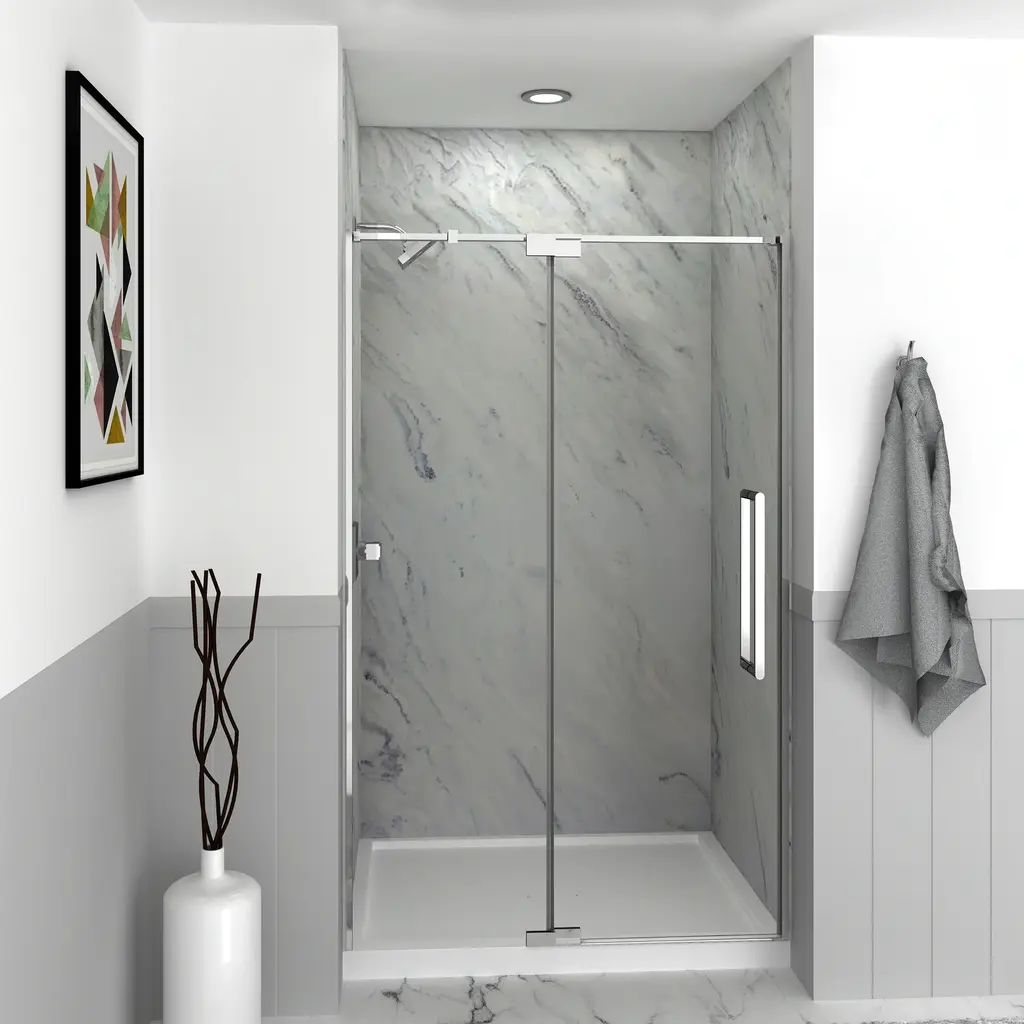 The Transolid Irene Pivot Shower Door Collection combines the practicality of a space saving design with custom quality craftsmanship. The collection features thick, premium 3/8 in. (10mm) clear tempered glass with professionally applied Nano clear glass coating, which provides superior dirt and water repellant and stain resistant benefits. The Irene door provides up to 1/4 in. of out-of-plumb adjustability on each side to provide a watertight fit in your alcove. The Irene Door is available in several different width, height and color combinations to match your bathroom's interior design and layout perfectly. Built for an alcove (3-wall) shower enclosure, pivot shower doors can be installed to open from the left or right with one panel remaining fixed. Multiple Transolid handle options are available, but this combination features the Riley handles, a unique, high-end design, adding a distinctive look to your Irene shower door. These handles are substantial in weight and are every bit as functional as they are beautiful. Look for the matching grab bar to complete the look!Transolid IPD487610C-R Features: