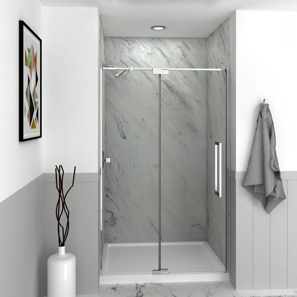 The Transolid Irene Pivot Shower Door Collection combines the practicality of a space saving design with custom quality craftsmanship. The collection features thick, premium 3/8 in. (10mm) clear tempered glass with professionally applied Nano clear glass coating, which provides superior dirt and water repellant and stain resistant benefits. The Irene door provides up to 1/4 in. of out-of-plumb adjustability on each side to provide a watertight fit in your alcove. The Irene Door is available in several different width, height and color combinations to match your bathroom's interior design and layout perfectly. Built for an alcove (3-wall) shower enclosure, pivot shower doors can be installed to open from the left or right with one panel remaining fixed. Multiple Transolid handle options are available, but this combination features the Sabrina handles, a unique, high-end design, adding a distinctive look to your Irene shower door. These handles are substantial in weight and are every bit as functional as they are beautiful. Look for the matching grab bar to complete the look!Transolid IPD487610C-S Features: