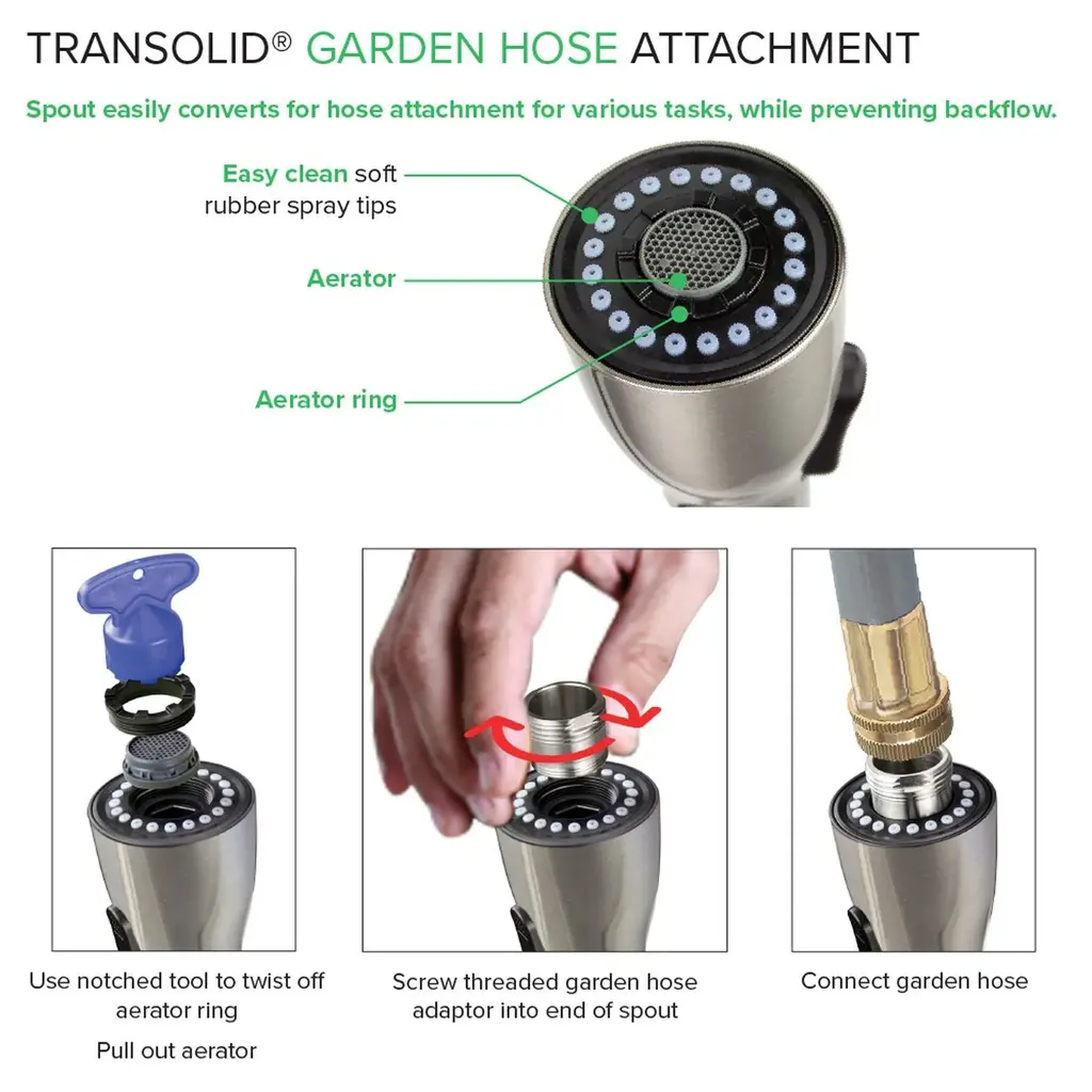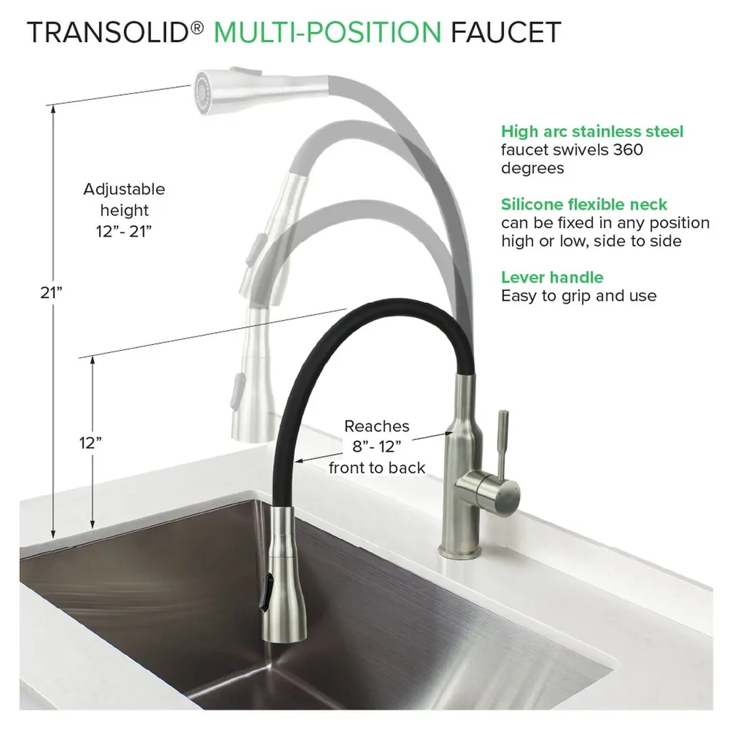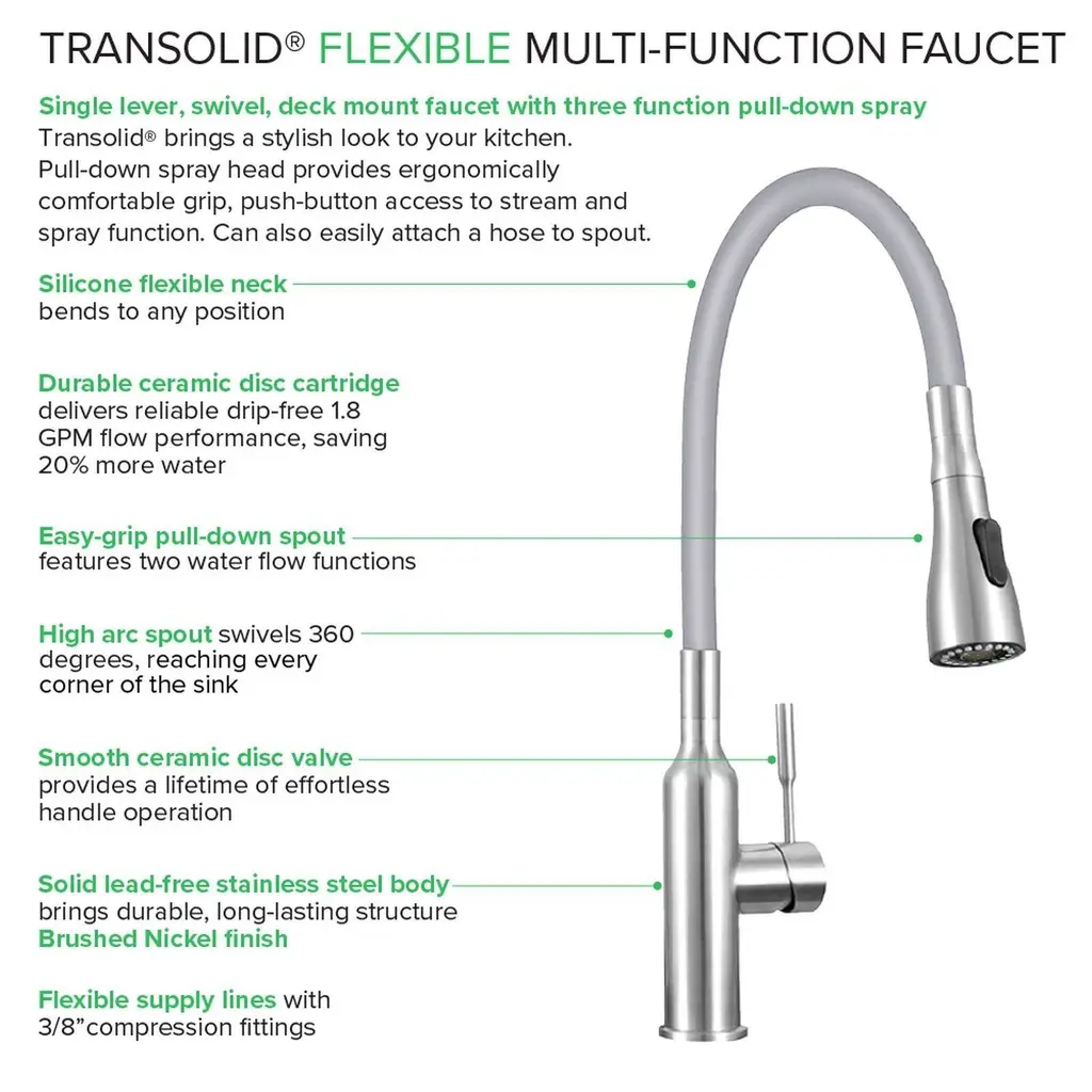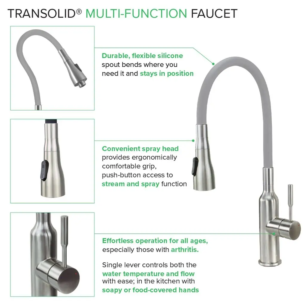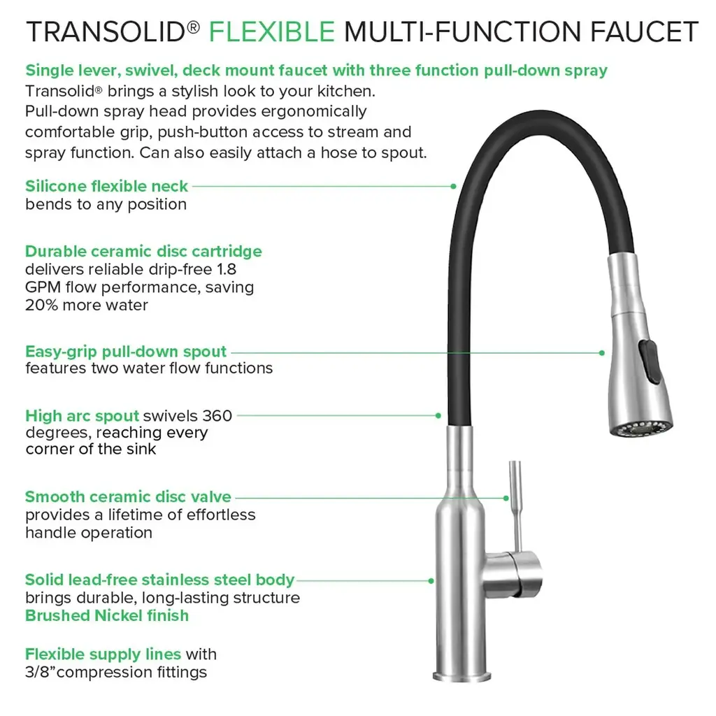 The all-new Transolid PF7509A Faucet combines beauty, functionality, and innovation- creating the perfect combination for your kitchen or laundry room! This Transolid faucet features a stainless steel body with a brushed nickel finish and a modern black silicone-covered high-arc spout; its versatile style will blend seamlessly into any design. Design style aside, this faucet is also a breeze to use! The single-lever handle controls the water temperature and water pressure while the simple spray head button switches between the stream and spray function with ease. The high-arc neck swivels 360 degrees to reach every corner of the sink, and it is ultra-flexible, with the ability to bend and hold any position- making it the perfect tool to tackle big messes!