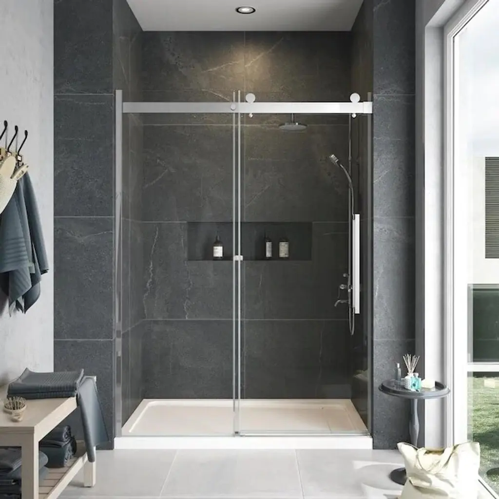 The Transolid Madeline Frameless Sliding Shower Door Collection offers an elegant, sophisticated look. It is available in 60 in. W and either 60 or 76 in. H and features thick, premium 5/16 in. (8mm) clear tempered glass with professionally applied Nano clear glass coating, which provides superior dirt and water repellant and stain resistant benefits. TruMotion® technology makes our shower doors close softly and effortlessly no matter how hard you slam them or how heavy they are and the Madeline door provides up to 3/8 in. of out-of-plumb adjustability on each side to provide a watertight fit in your alcove. The Madeline Door is available in several desirable hardware finish options to match your bathroom's interior design and layout perfectly. Built for an alcove (3-wall) shower enclosure, this door can be installed for the door to slide on the left or the right, with the other panel remaining in a fixed position. 20 in. (500 mm from center to center) vertical shower door handles enhance the modern look. Multiple Transolid handle options are available, but this combination features the Riley handles. The Riley handles feature a unique, high-end design, adding a distinctive look to your Madeline shower door. These handles are substantial in weight and are every bit as functional as they are beautiful. Look for the matching grab bar to complete the look!Transolid MBDT607608FL-R Features: